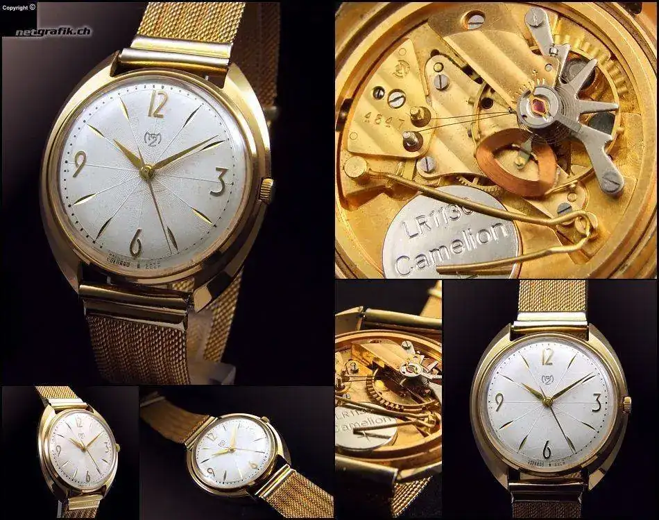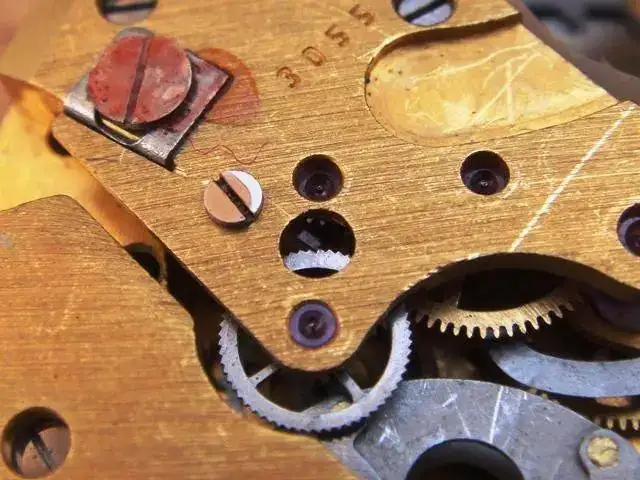 Aquí vemos el calibre, un 3055 híbrido, con una parte totalmente mecánica (tren de rodaje, volante) y una parte eléctrica compuesta por un circuito de cuarzo y un transistor electromagnético que controla el escape. Relojes electromagnéticos hay de diferentes tipos, pero no fueron muchas las marcas que los fabricaron; en este enlace podemos encontrarlos a casi todos.