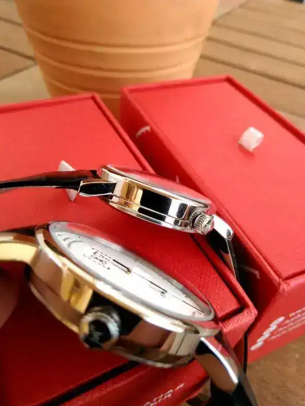 Una de las razones de peso para la compra de estos modelos fue que la caja es de acero frente a los tradicionales monoaguja con caja cromada, enteramente pulidas y con ligeras diferencias, la más apreciable a simple vista recae en las coronas (ambas firmadas), situada en el modelo de caballero a las 3 y a las 2 en el de señora, no veo ninguna razón salvo la diferenciación estética para que tengan distintas ubicaciones.