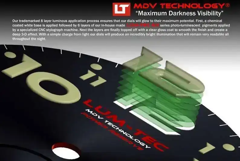 Respecto a las multicapas de superluminova que antes comentábamos, existe una tecnología muy interesante denominada MDV (Maximum Darkness Visibility) patentada por LUM TEC (relojera americana con acabados suizos y mucha maquinaria japonesa a altos precios) que consiste en aplicar 8 capas, la primera blanca de dióxido de titanio para maximizar la reflectancia por fosforescencia, a continuación 6 capas de pigmento superluminova customizado y una última de material cristalino para generar un efecto 3D y rematar el acabado.7. ¿Hay calidades en superluminova?