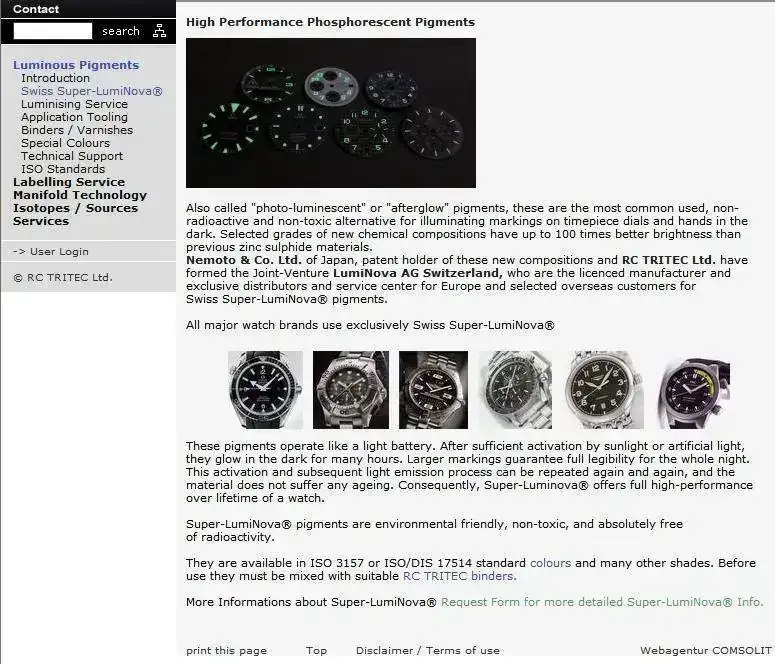 Unos años más tarde, Nemoto & Co. Ltd. poseedora de la patente de luminova y RC Tritec Ltd. constituyeron una empresa llamada Luminova AG Switzerland, los cuales son manufactureros y distribuidores de pigmentos superluminova instalados en relojería de gama media-alta suiza (Breitling, IWC, grupo Swatch, etc…) en la actualidad.