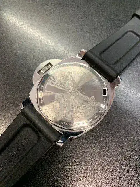 Su esfera estéticamente es como la de un Pam LOGO 005 (pura esencia Panerai) pero en la parte trasera lleva un excelente trabajo de grabado en la que se ha representado el puente de Brookling. Una pieza escasísima y con un buen valor coleccionable. A título de ejemplo, hace mes y medio coincidí en un evento con el staff de la marca para España y quedaron prendados con la pieza por lo difícil de verla en vivo.