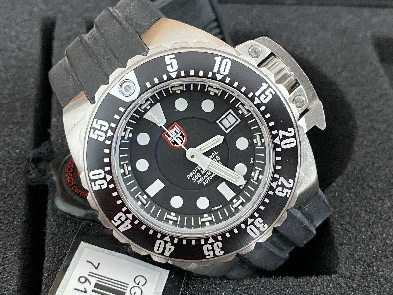 Caja de acero de 44mm con bloqueo de bisel. Cristal de zafiro con anti reflejos. Luminiscencia por microtubos de gas (25 años de vida), sumergible 500 m con válvula de helio...