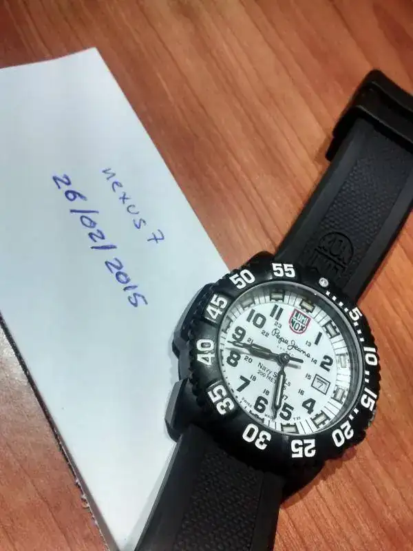 Como puntos negativos, no conservo la caja (las mudanzas hacen estragos), y tiene dos marcas, una minúscula en el cristal, entre las 11 y las 12, que apenas se ve y hay que fijarse con lupa, pero esta ahí. Y otra marca en el bisel, un arañazo que afecta al indicador (perdió la luminiscencia), y a la zona del "5". He sacado con el mayor detalle posible estos defectos en las fotos. Es por ello, que pongo un precio bastante interesante (echad un vistazo al PVP de esta pieza nueva).