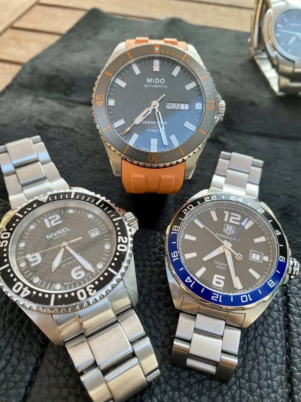 En nuestro caso, yo he optado por el Mido Ocean Star, Nivrel y Tag Heuer Formula 1.