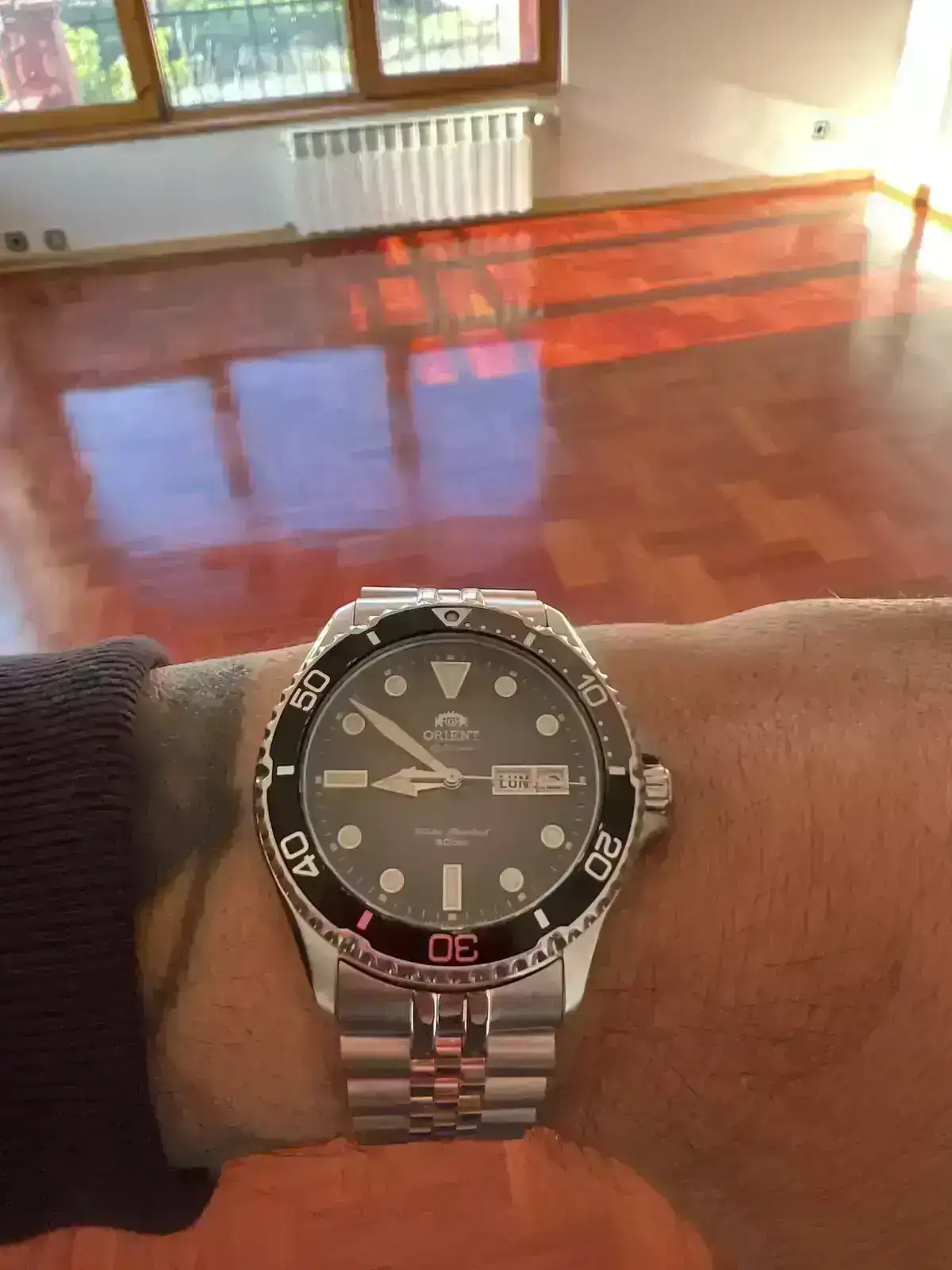 Tiene una esfera muy bonita, aunque yo no sé fotografiarla para ver sus matices , el suelo también es bonito , sigo dándole ultimo empujón antes de dejarlo con acabado satinado.Como me gusta, Antonio. Y el suelo, telita.