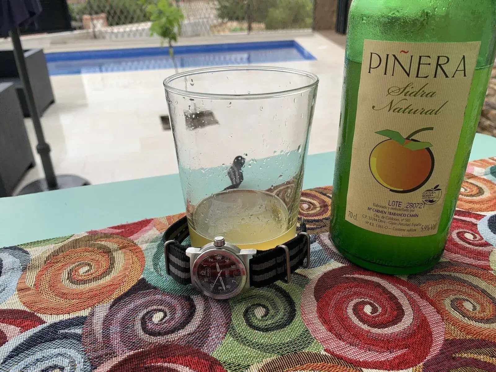 No se puede tomar sidra en esi vasu tan gordo, no sabe igual. Tíralu a la piscina.
