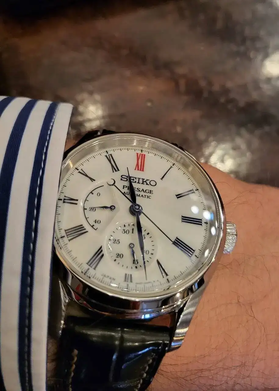 Es precioso. Y esa correa de 🐊 o de 🐍 le queda elegantísima con esa esfera negra y el cristal o plexy abombado. Guapísimo.