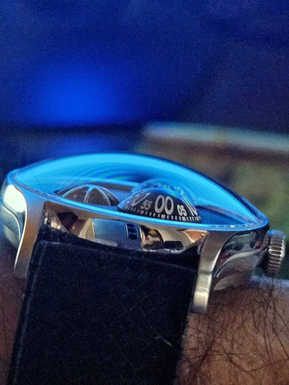 Me encanta precisamente por su marcado aire a los inalcanzables MB&F.El efecto que se ve en el cristal creo que es el AR coating cuando recibe luz azul de la pantalla del ordenador. También me sorprende la poca distorsión del reflejo en en lateral de las caja, entre asas: un verdadero mirror polishing. Me decía un colega "últimamente siempre llevas el Le Dome" y sí, tengo relojes bastante mejores pero este tiene una especie de rollo "futurista" o ciencia ficción, me recuerda mucho a MB&F en versión asequible