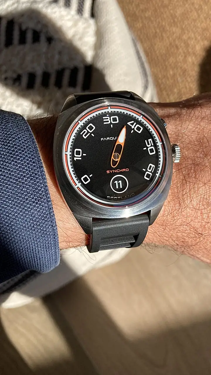 Hay que joderse...Es un hora saltante / retrógrado: el círculo a las seis es la hora (11) y la aguja retrógrada saltará hacia atrás cuando alcance el 60. Ahí son las 11:37