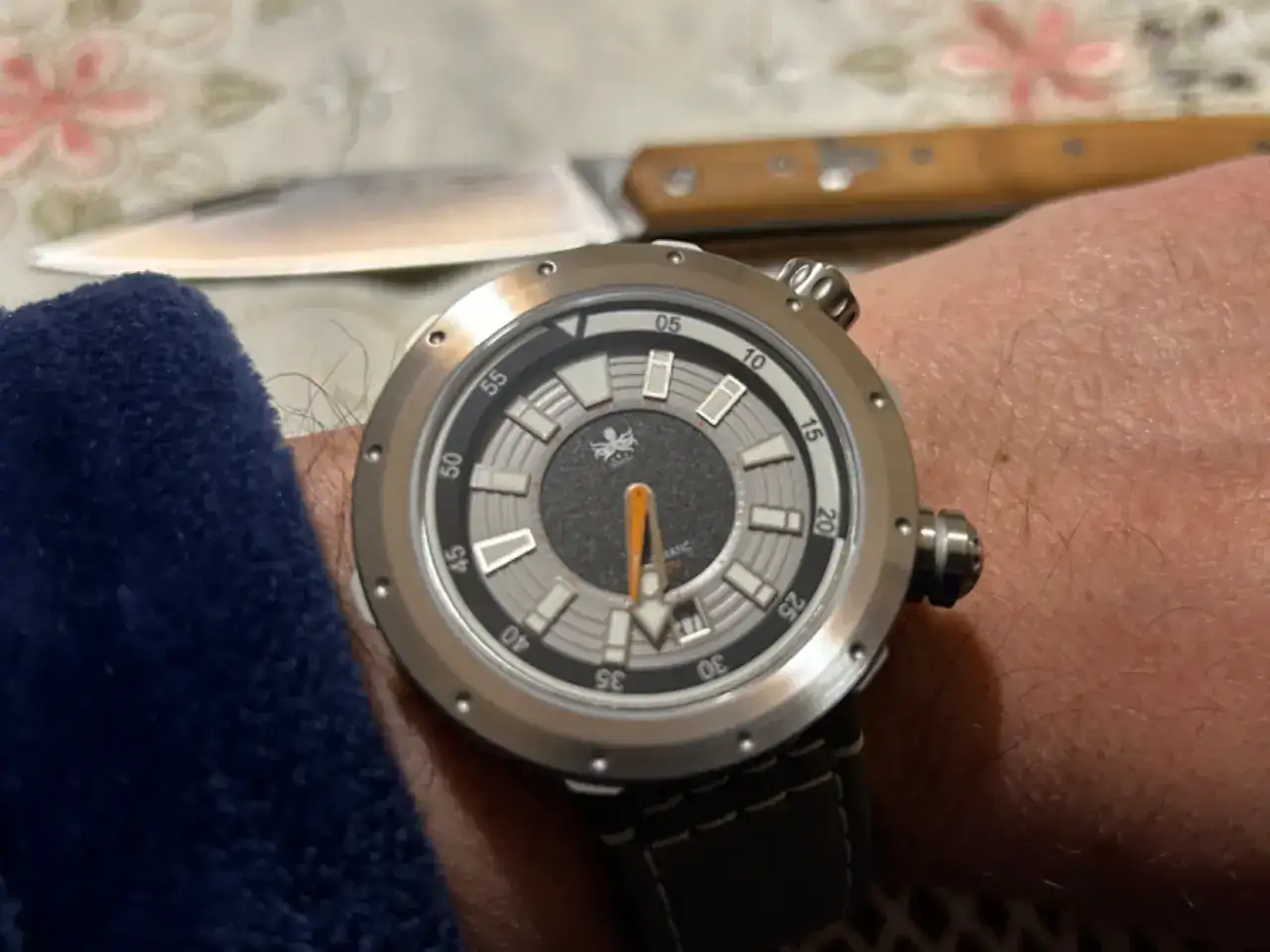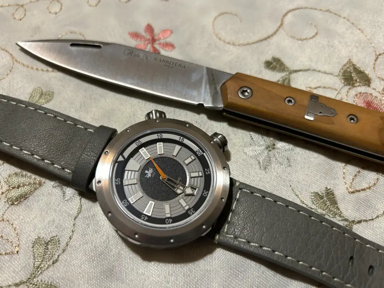 Como me gusta ese reloj!!Buen inicio de semana a todos . Sigo con mi Phoibos Vortex , controlando la exactitud de su movimiento suizo y hoy acompañado de una navaja soberbia, una cabritera de Albacete.