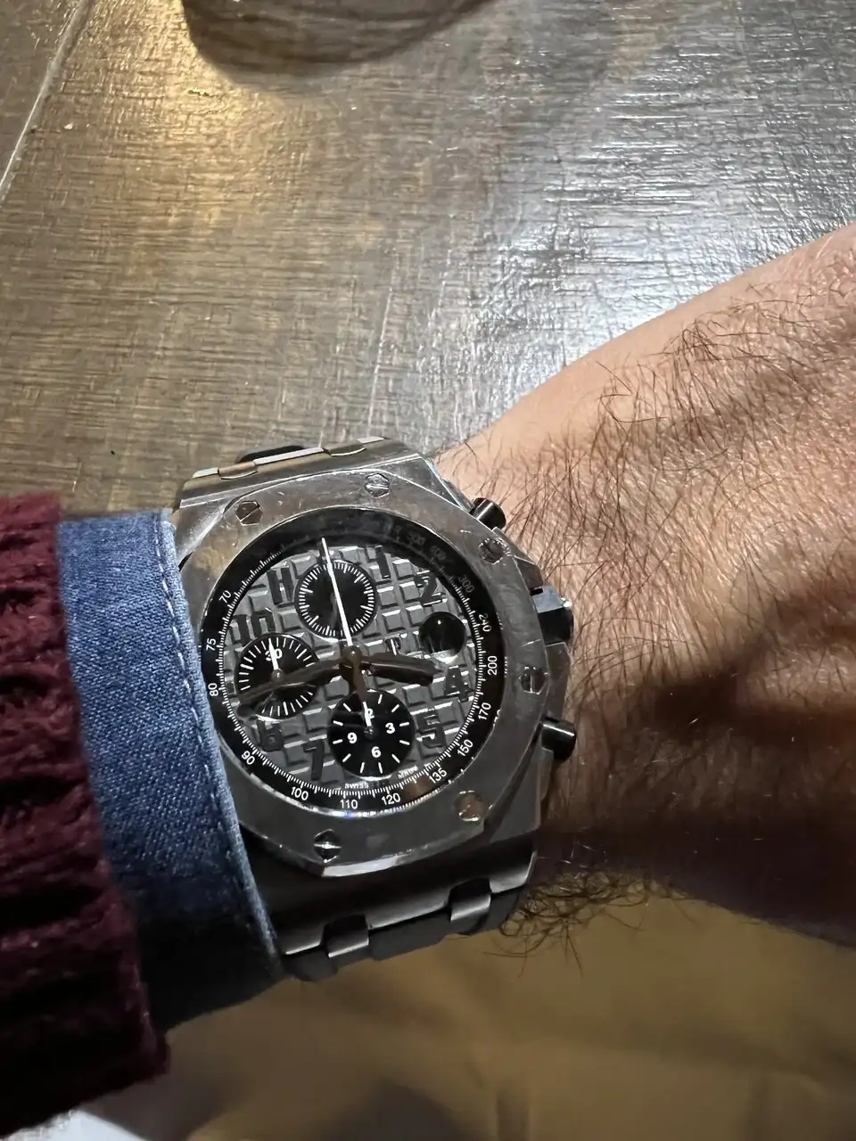 Pues a mi me encanta, tamaño incluidoNo se qué os parece a vosotros pero yo me veía enorme su AP de 44mm. Además el cronógrafo hace que tenga la caja muy alta.