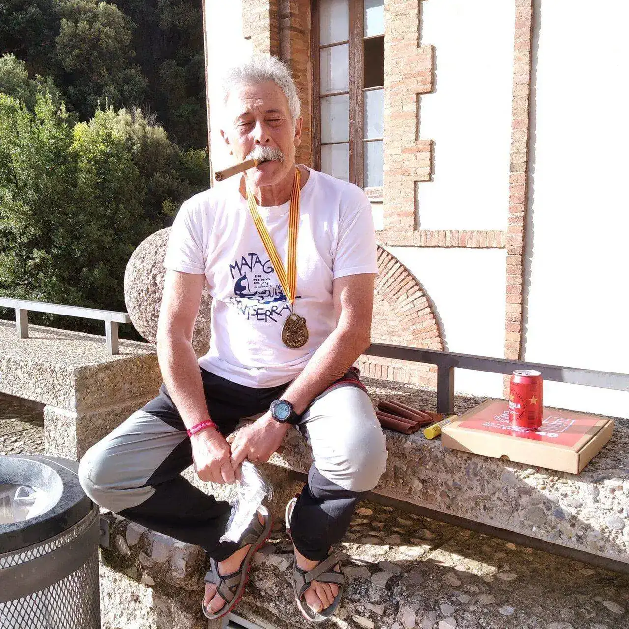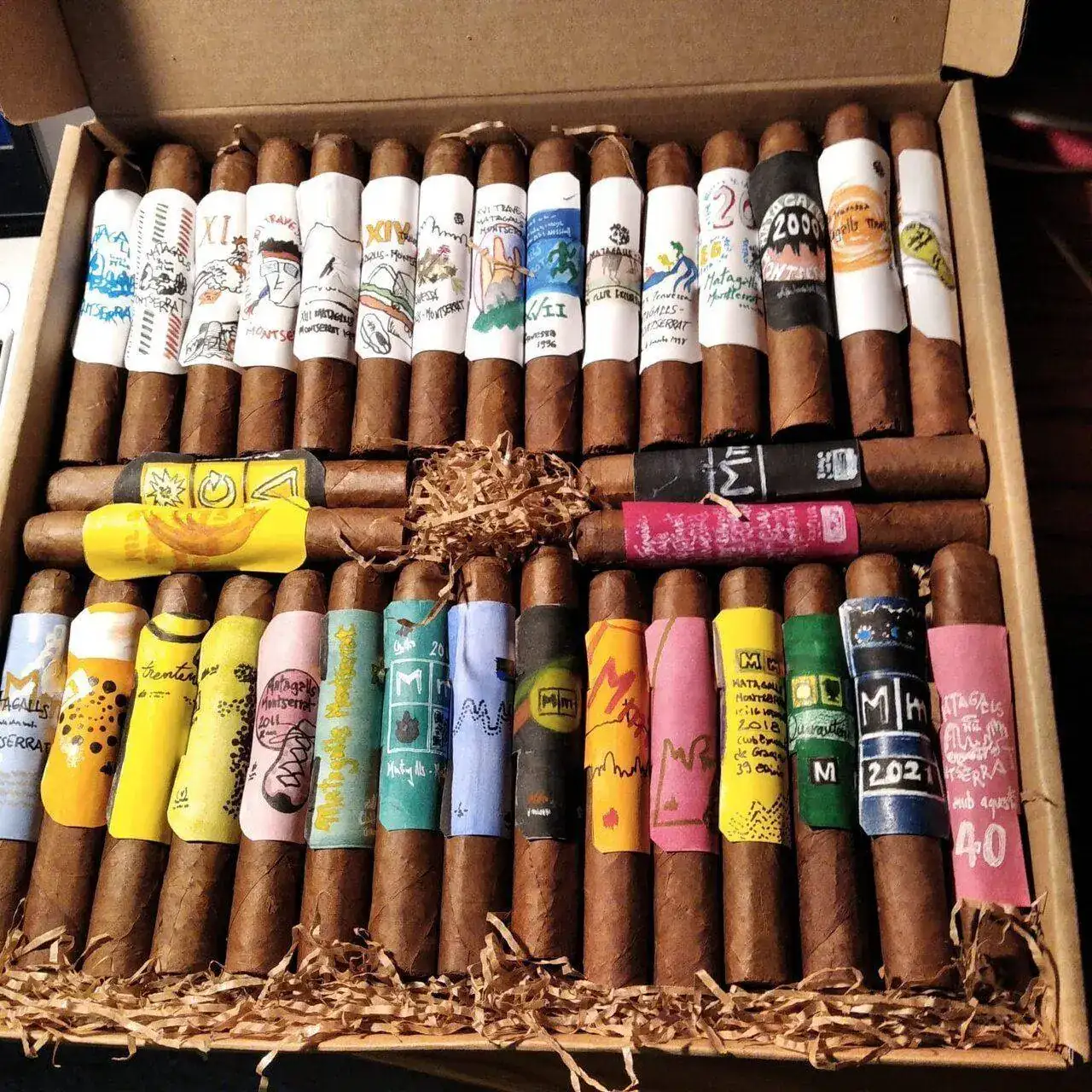 Toma ya! Mira que me gustan estas cosas. Molt bé, company!Hola compañeros y compañeras de RE, como continuacion a mi aportacion en el hilo diario del sabado pasado, hayer domingo complete mi 40a participacion en la marcha de resistencia Matagalls Montserrat en un tiempo de 18,00horas, fue un dia de gloria inesperada pues vivi muchas sorpresas inesperadas, como costumbre final a la llegada siempre me fumo un habano, pero este año me esperaba una caja de 40 habanos "Partagas" con una vitola que reproducia el emblema de cada edicion y la ultima con la de 40 edicion que me fume para celebrarlo.