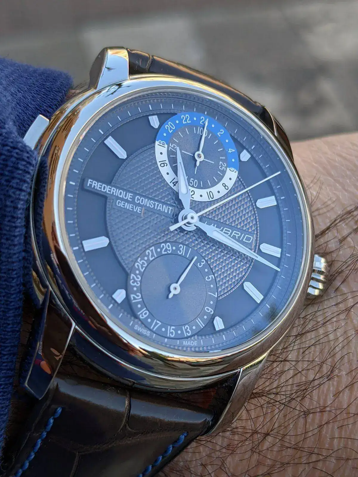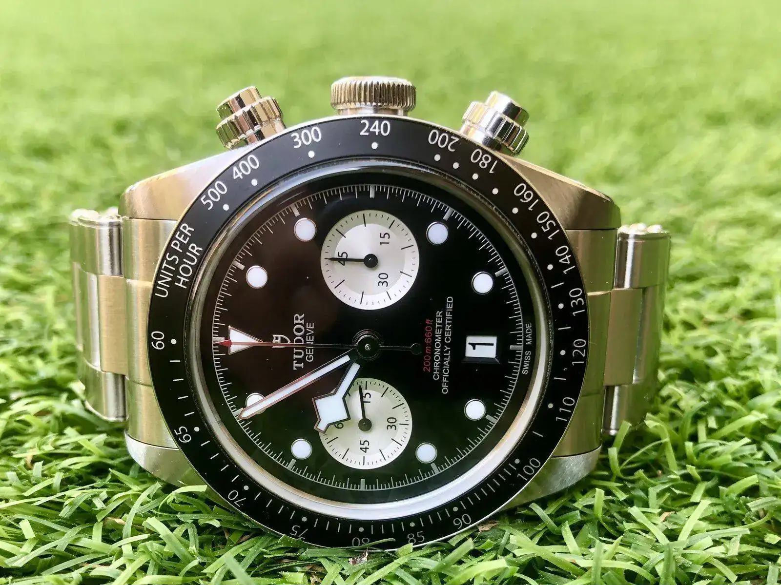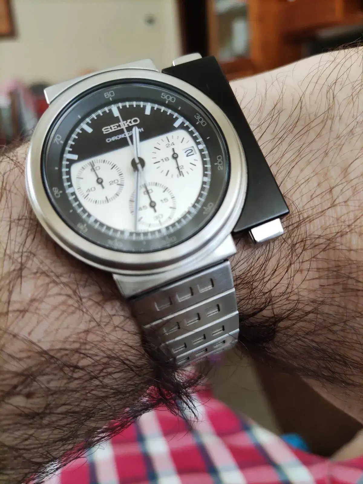 Tengo que llevarlo a que lo revisen, si te fijas una de las agujas del crono no queda en su sitio y los pulsadores fallan algo. Pero ya son más de 20 años los que tiene. También diré que le cambien juntas y hagan una prueba de estanqueidad que éste si se moja tanto en la ducha como algún chapuzón en verano y nunca se le ha revisado esto.