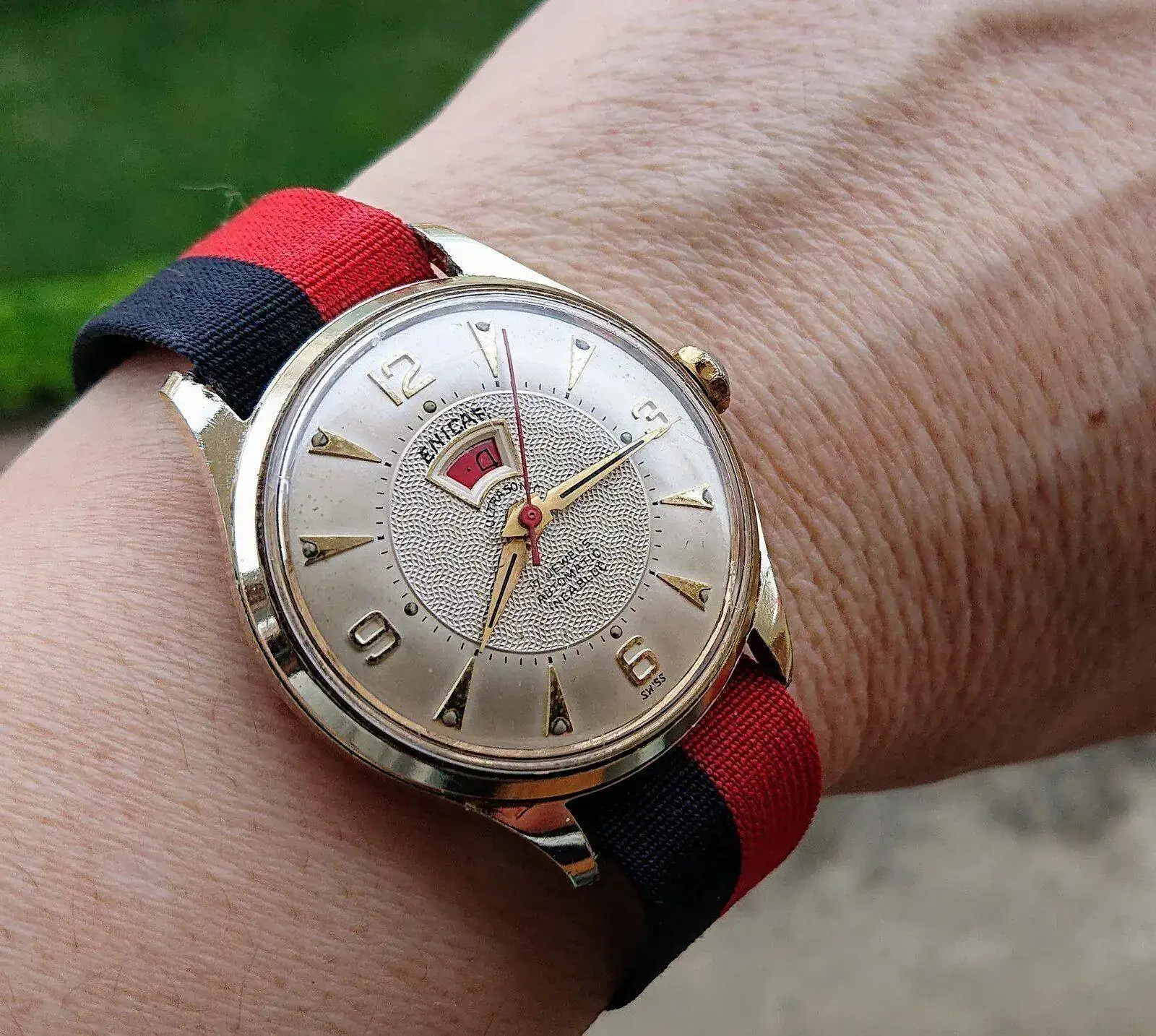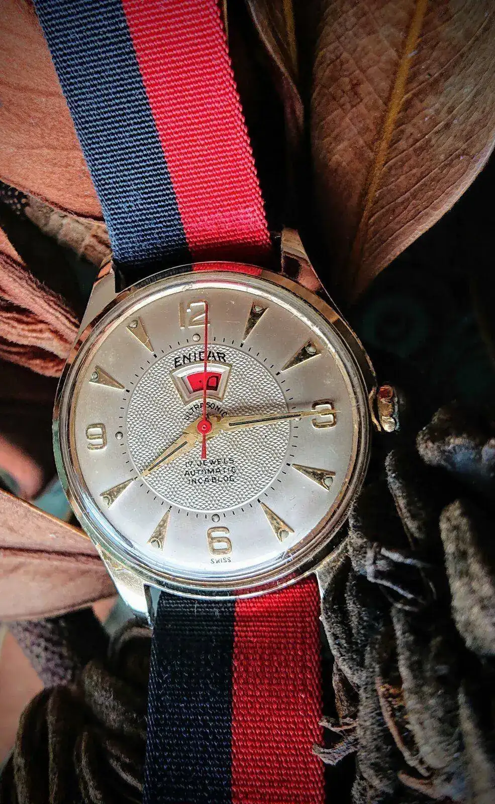 ¡Buenos días! Doble hilo hoy, más vale que sobre... Éste se ha abierto un poco antes, así que aquí me vengo con mi Enicar aún "en reserva". Cuando lo he sacado de la camita, totalmente parado, claro, marcaba la hora y los minutos exactos; nunca me había coincidido no tener que ajustar nada en el reloj (no suelo usar cuarzos)