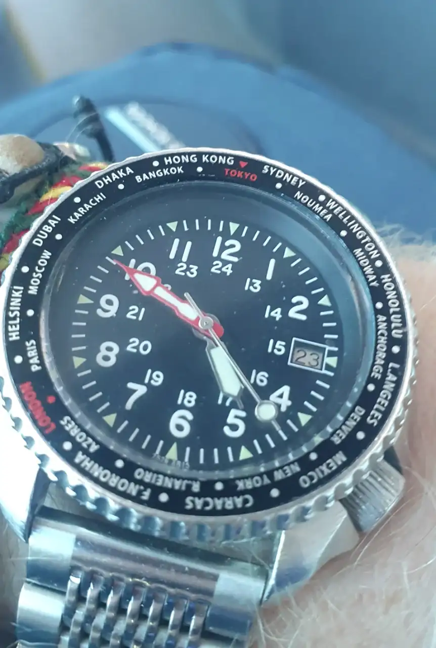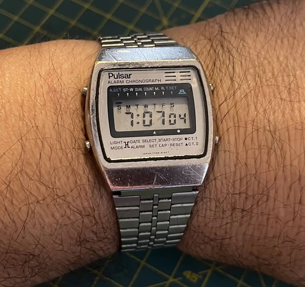 Este es el otro reloj que he conseguido hacer funcionar de los que me traje ayer del mercachuflo. Es un Pulsar Y759-5162 A2. Supongo que de la primera mitad de los 80, a juzgar por la bombilla de la luz. Creo que a estos aún no se les podía poner la hora en formato de 24 horas, o es que aún no he encontrado la forma de hacerlo. Estos cacharritos, lejos de los relojes que suelen exhibirse por estos lares, me tienen embelesado, tanto o más como los automáticos populares japoneses. El armis no es suyo, es de otro reloj de la época pues, el suyo me iba pequeño y no he encontrado la forma de adaptarlo manteniendo las piezas con el nombre grabado. Así que le he puesto este, que es muy parecido, y el original lo he guardado en una bolsita con su nombre. Un saludo y muchas gracias.