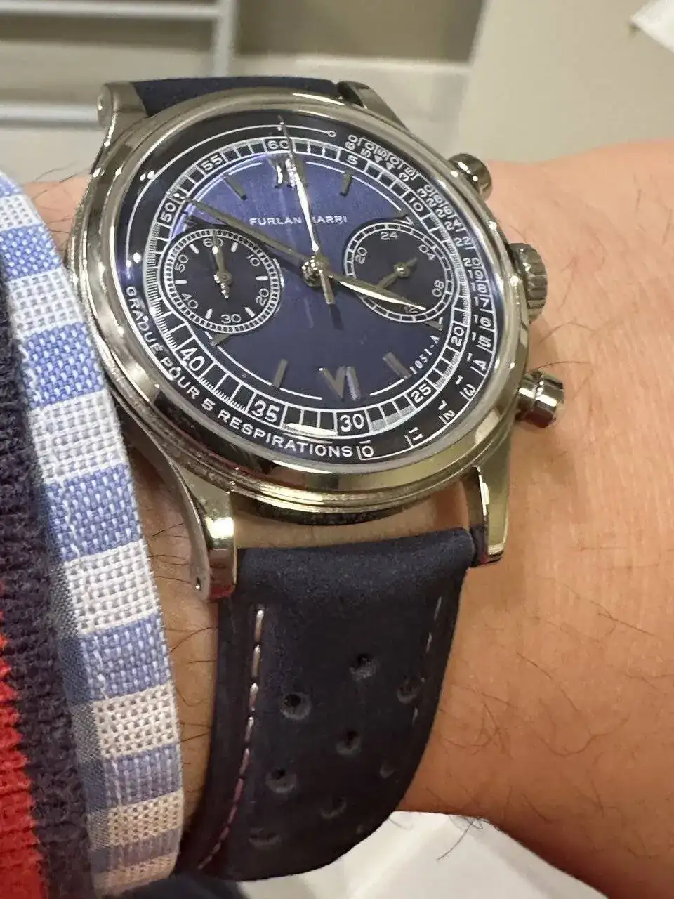 Reloj es precioso, muy a la moda ya que es de tamaño contenido ( yo habría preferido 42mm) una esfera muy bonita sin lumen y con un chrono mecaquartz de Seiko. Las correas malas para un reloj de este calibre ya que son de cuero vegetal y parecen plástico. Por eso la llevo con esta tipo Tag que EMO le sienta genial. En general está bien, pero hay que tener en cuenta que no es un reloj barato. Se queda en más de 1000 euros después de impuestos etc ya que se tiene que comprar a Suiza