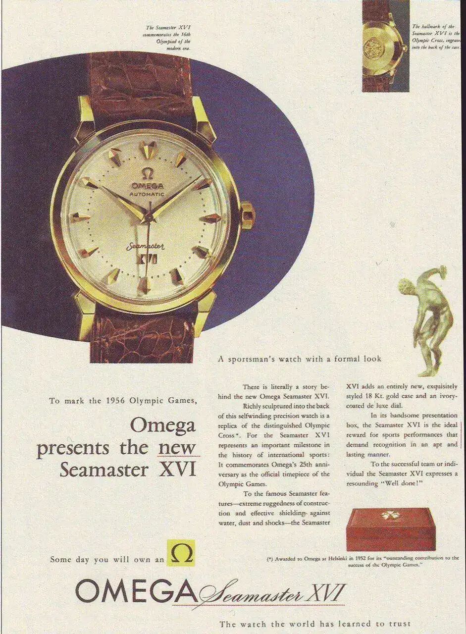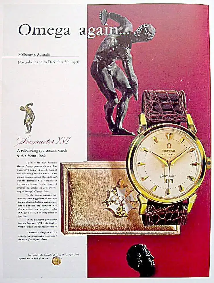 ¡Muchas gracias, Walter! El reloj es un Melbourne, lanzado en 1956 con ocasión de los decimosextos JJOO. El XVI hace referencia precisamente a eso, el número de la edición de los Juegos. Te dejo un par de publis