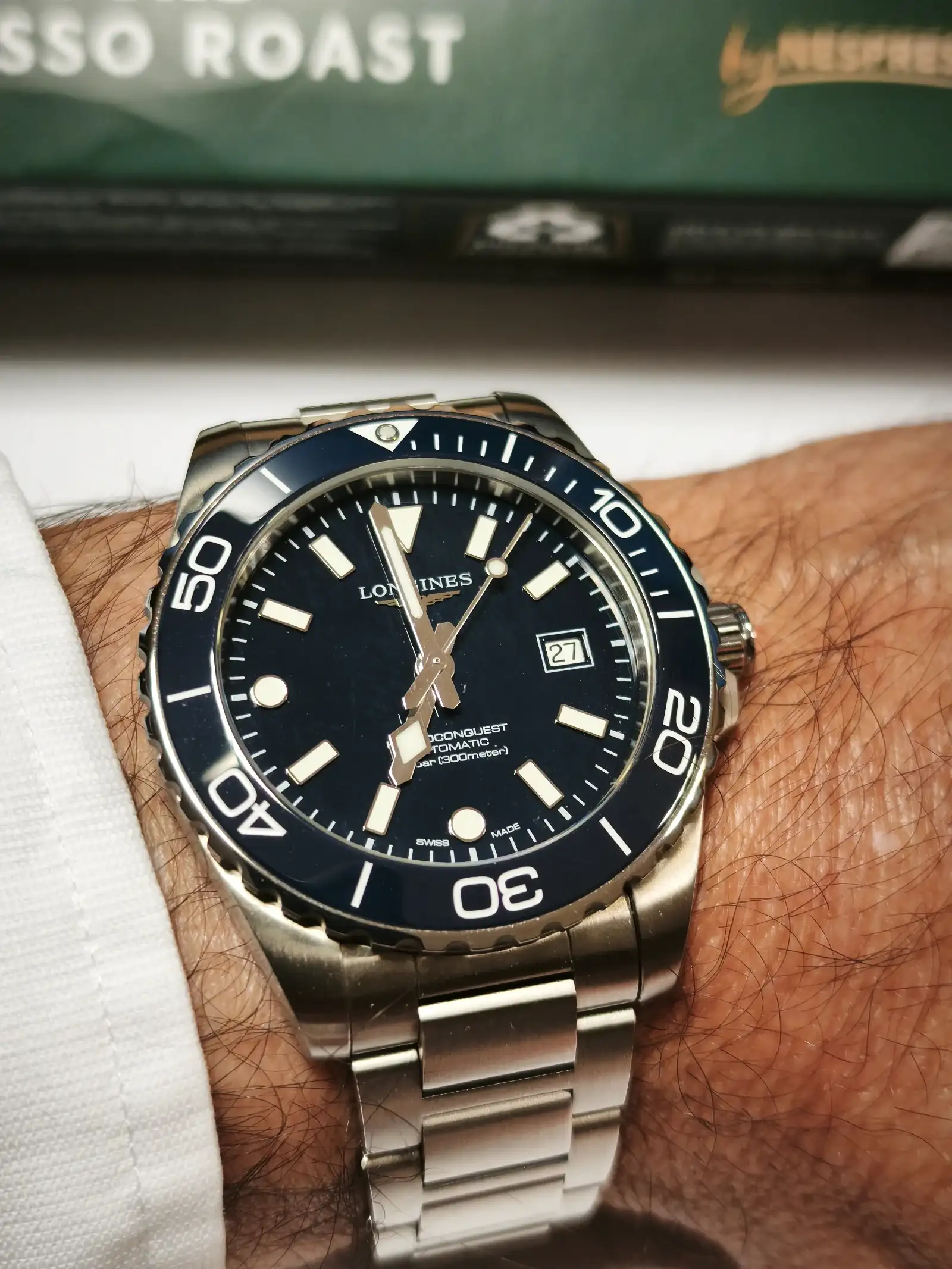 Buenos días! Estoy acostumbrado a llevar relojes grandes. Este hydroconquest es de 42mm. Mi muñeca es de 17,5 pero mido 1,90. Los relojes más pequeños no me gustan. Para mí es cómodo. No sólo han cambiado la esfera y el dial sino también el brazalete que ahora dispone de un nuevo cierre, es de acero cepillado. El brazalete es ahusado lo que lo hace más cómodo.que tal la sensación que transmite en muñeca?? si entra alguno este año el objetivo es este nuevo HC, aunque estoy dudando el color, pensaba en negro pero el azul si es como el del gmt me lo plantearia seriamente