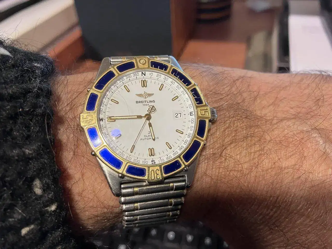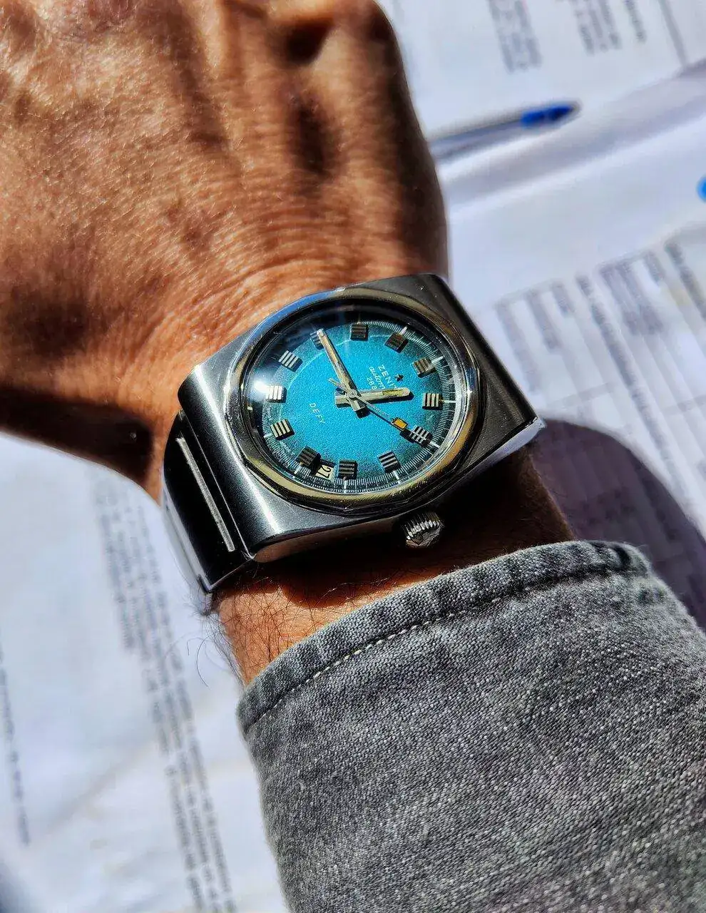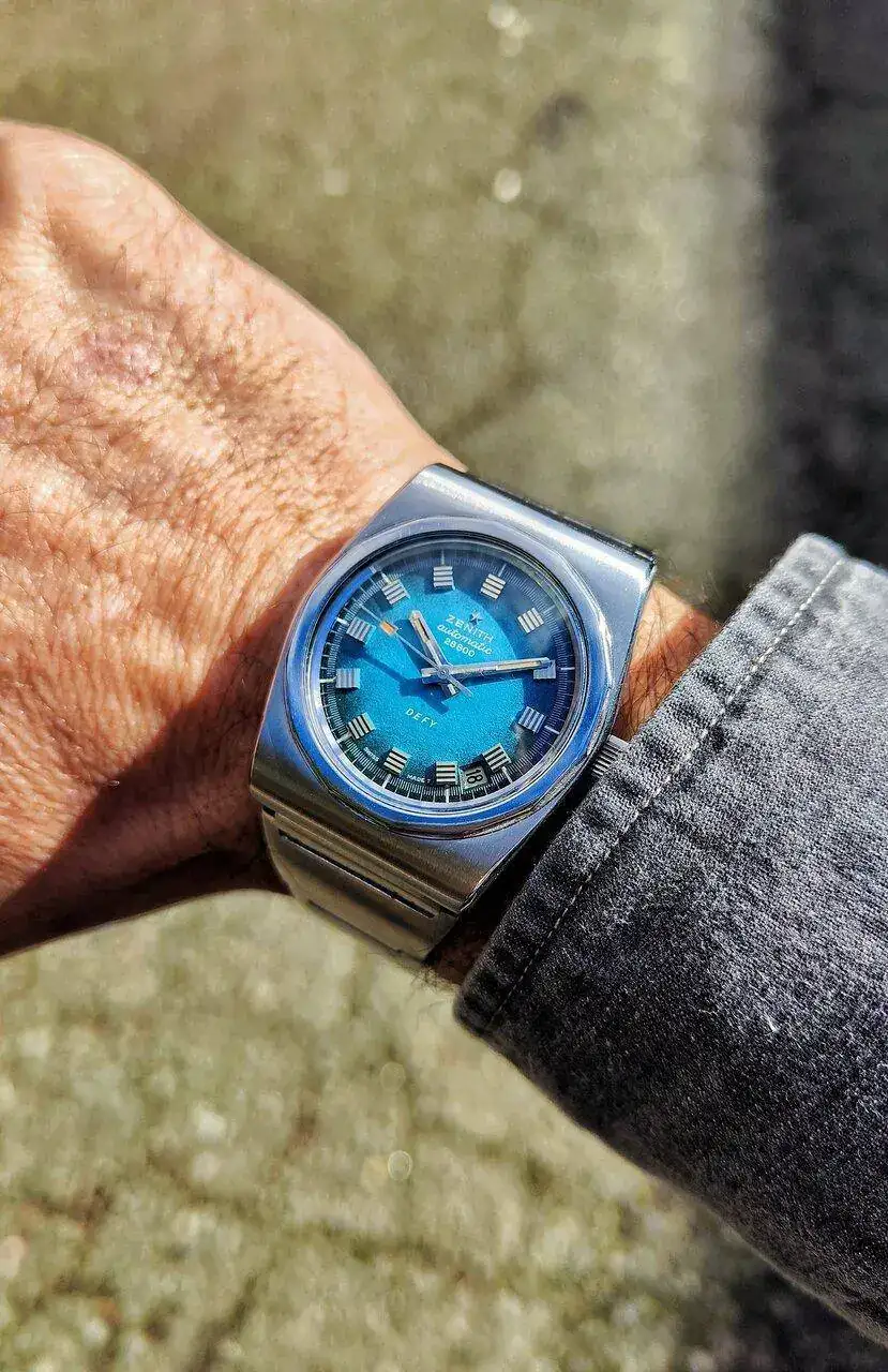 Hablando en una quedada con él , sobre los nuevos Zenith Defy revival y después de decirle que no me atraían mucho esas esferas setenteras 🫣🫣, me he puesto a buscar (pensando en encontrar alguna ganga para Osmpo ya que quería meter uno en su caja) y tanto he buscado que al final he caído antes que él 🤣, me he enamorado de su esfera azul y su mega aire setentero, con caja cuadrada y armis langostinilla y un calibre más que probado 2562pc.