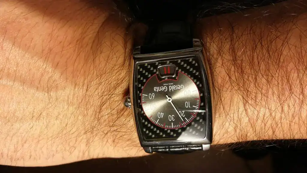 Hoy lunes 29 llevo un Victorinox Swiss Army, con brazalete de caucho, dial negro, y números y manecillas rojas.