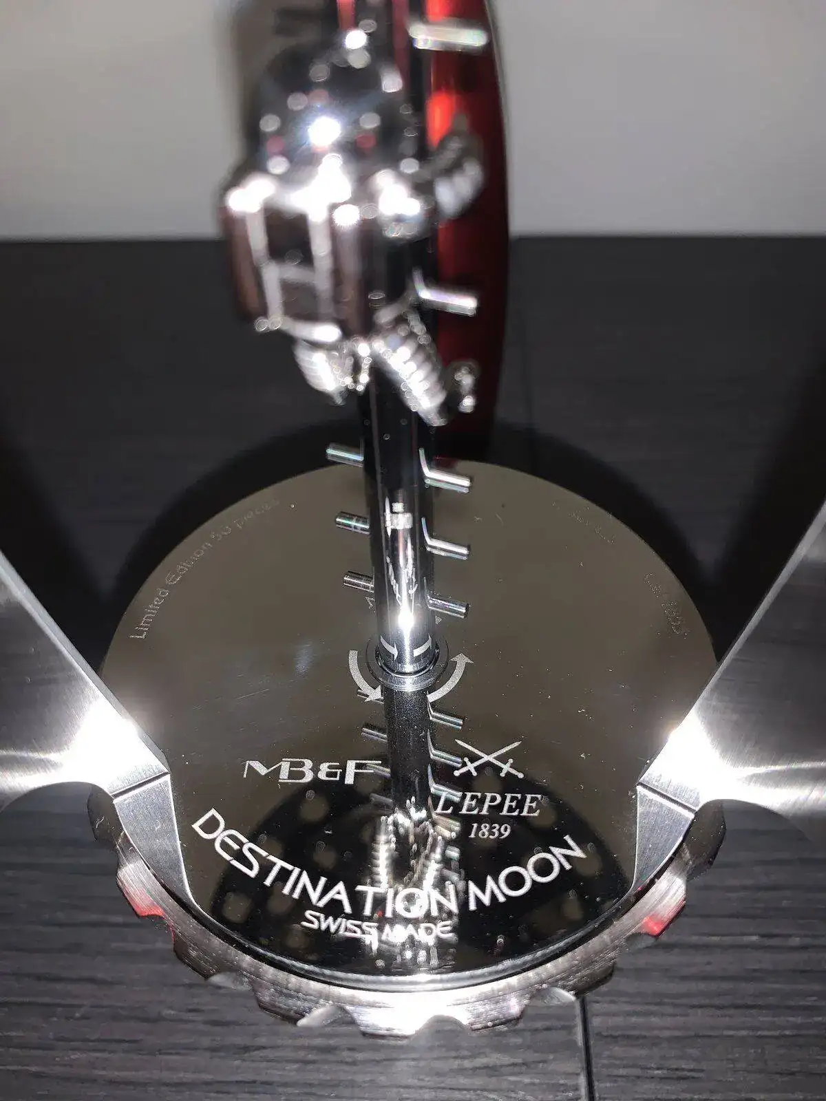 El funcionamiento, por adelantar, se basa en un calibre de L´ÉPÉE 1839 de cuerda manual con 8 días de reserva de marcha que mueve circularmente los dos discos digitales (horas y minutos). La cuerda se le da girando el soporte (la base de la foto donde viene el nombre de la marca) en sentido contrario a las agujas de reloj. A medida que giras ese soporte, la escalera con el astronauta gira también sobre si mismo haciendo el giro inverso a medida que transcurre el tiempo de la cuerda, provocando que la posición del muñequito en la escalera sea dinámica. Y la hora se configura con una corona perpendicular a los discos digitales justo encima de ella. Hay que poner esa vitrina porque el mecanismo está completamente a la vista y es fácil que con el tiempo se llenase de polvo cualquier pieza (en especial el volante que se ve justo debajo de los discos digitales) y luego limpiarlo sin toquetearlo mucho se aventura harto complicado…