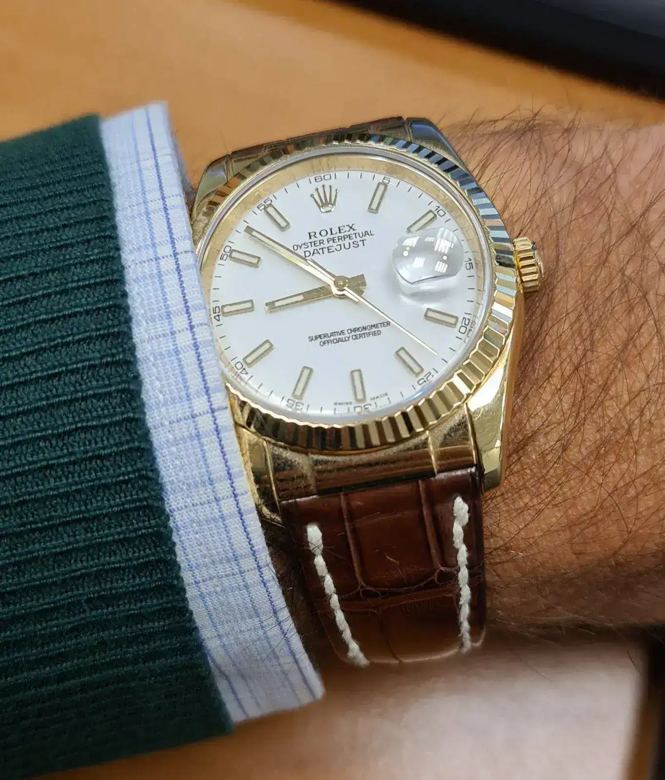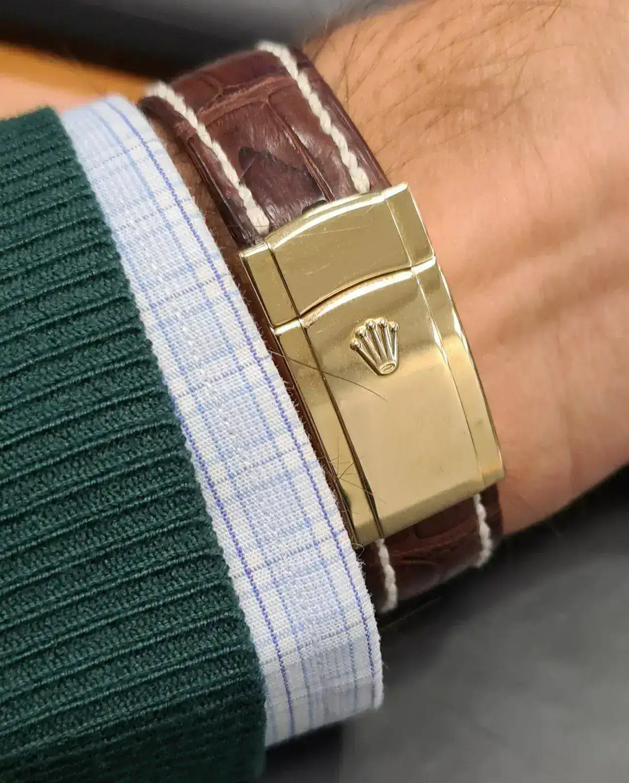 Pues esta combinación le queda de maravilla, muy elegante.Hoy éste con todo su hardware, que suelo llevarlo con un caucho negro y hebilla Rolex.