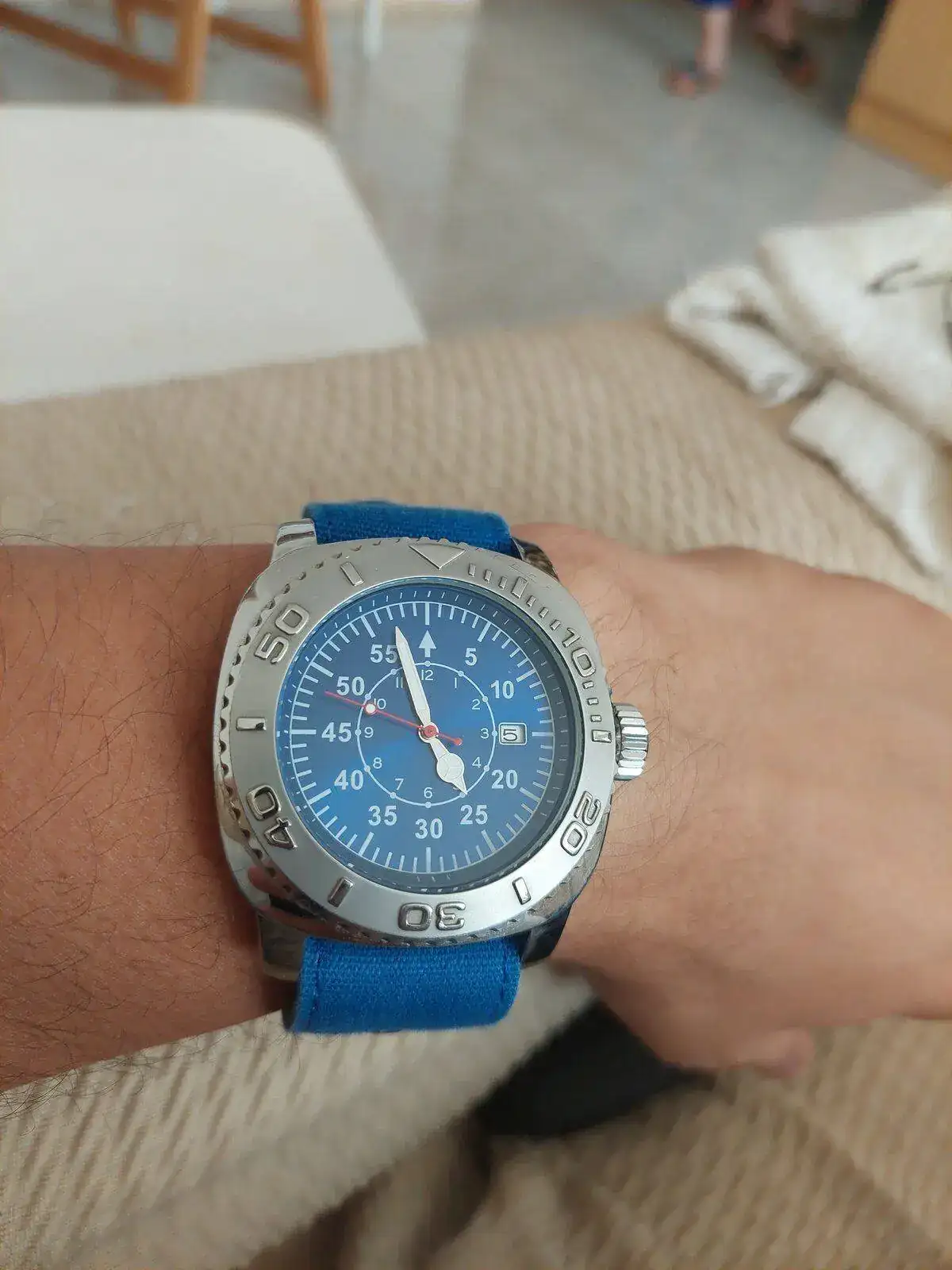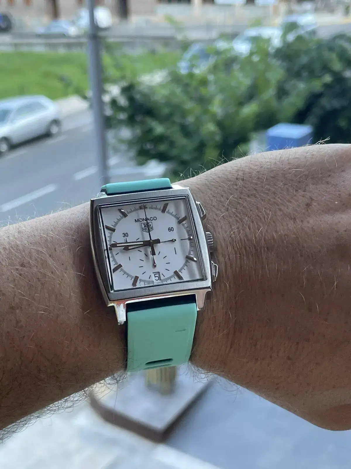 Arriesgada combinación....pero no está tan mal.Con mi tag heuer mónaco veraniego (correa garmin 🤦♂️), pero es que es comodísima.