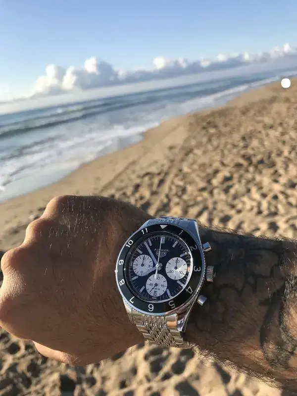 Caja cerámica gris mate, bisel cerámico, chrono flyback con pulsadores accionables bajo el agua, 300 m WR, 36.000 alternancias, calibre manufactura que te cagas en las bragas... en fin, y un montón de virtudes más: