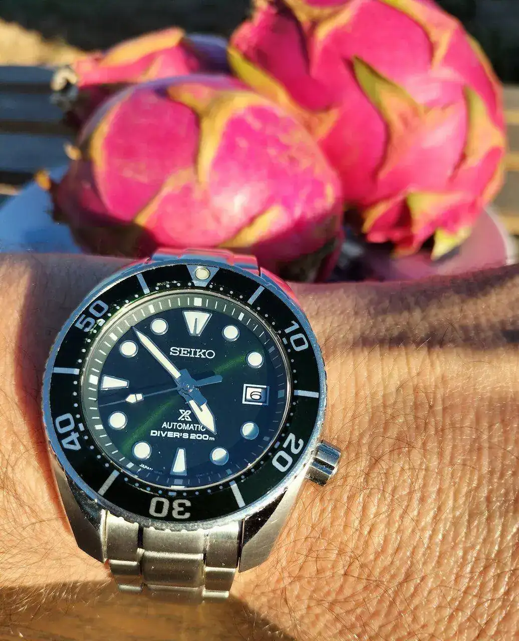 Parecen las frutas del dragón. Por dentro blancas con puntitos negros. Muy buenas.Con unas pitayas rosas de fondo, creo que se llaman. A ver si me gustan, porque es la primera vez que las voy a probar. Reloj japonés con fruta que parece una baya Pokemon. Todo queda en casa 😉.