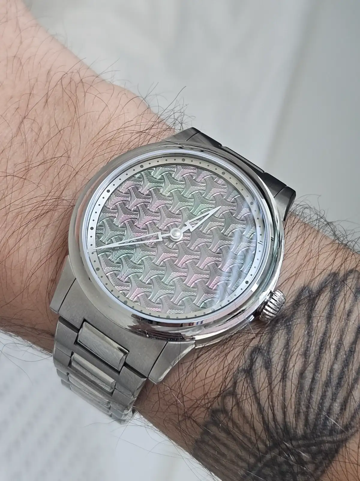 El cuadrado de debajo del soporte, es a modo de bandejita, donde desde ahora en adelante irá un artilugio (autoconstruido reciclado) que uso para dar cuerda a algunos relojes que por tamaño de la corona tienen mas dificultad, y asi no rozar en exceso con los dedos la caja, que a la larga dejaría señales. La planchita lateral es solo para tapar la terminacion de la espiga que atraviesa el soporte, ya que va pegado con un emplaste hecho con cola comun mezclada a 50% con polvo de serrín, lo que asegura un pegado eterno, pero se endurece tanto que me descuidé un poco en quitar el sobrante, por lo que al hacerlo, le hice señales que afeaban, por lo que decidí hacerle esa "tapa". Las piezas metalicas que lleva en los laterales del pie abajo, son angulos de aluminio para evitar que quede cojo y se mueva el conjunto, ya que al estar hecho a mano sin maqina de carpinteria profesional, no quedaba una superficie perfectamente plana y cojeaba un poco, y asi no se mueve en absoluto, ademas lleva sus cuatro adesivos de silicona y queda "perfecto".