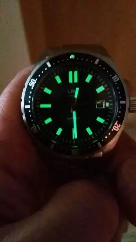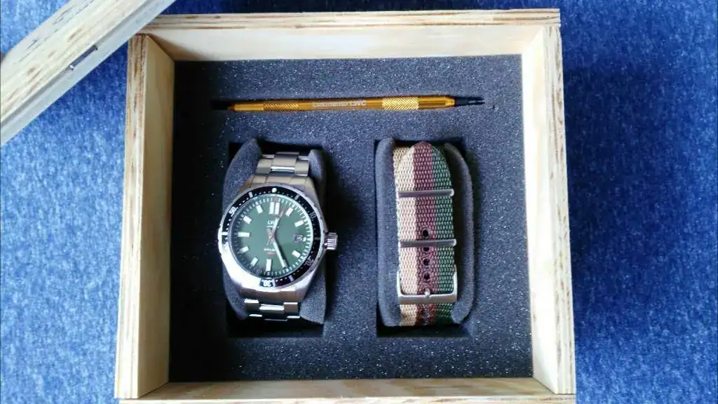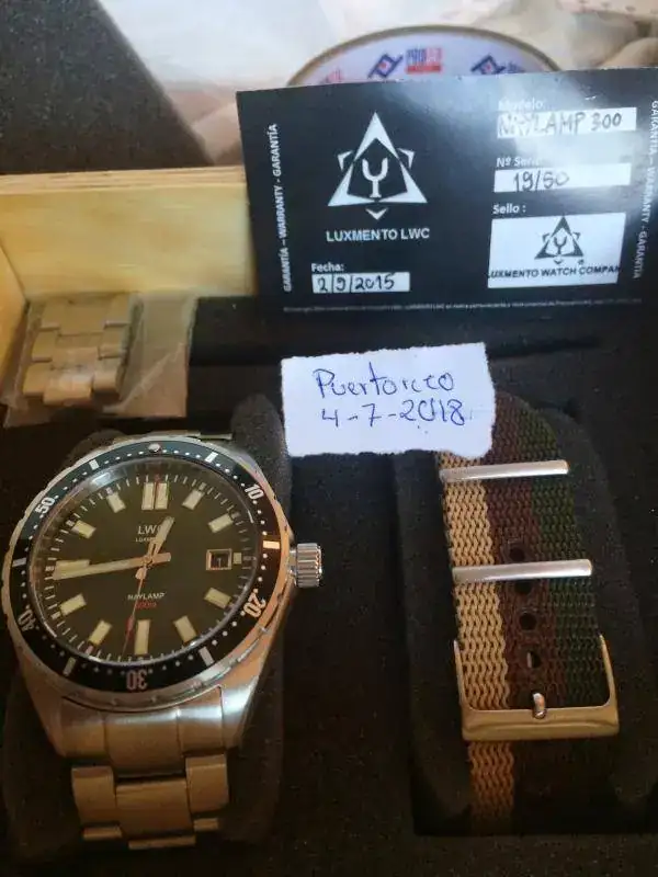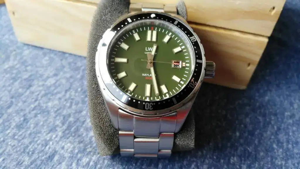 Es un diver contundente, 300 metros, zafiro, maquinaria Seiko NH35 bien ajustado.Armis de acero con eslabones macizos. Esfera verde con magnífico lumen. Va con armis y nato, caja, y tarjeta de garantia.