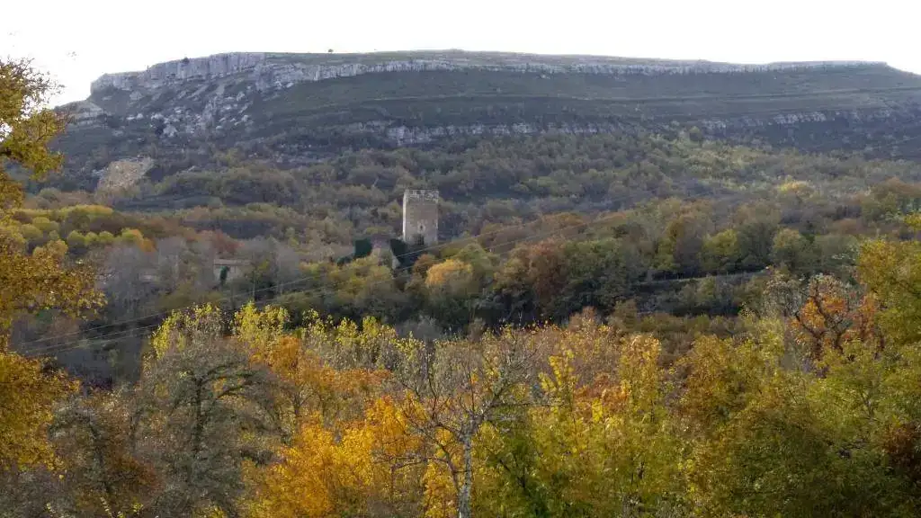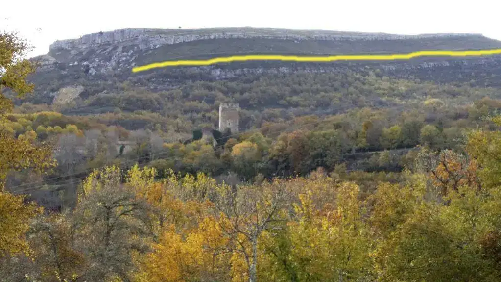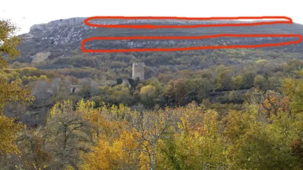 En la decimotercera foto (la treceava, que dirían algunos) veo al fondo una raya casi recta que recorre la mitad del verde en la ladera. ¿Hay en la izquierda una cantera?. Porque parece que fuera un carril para sacar la piedra.