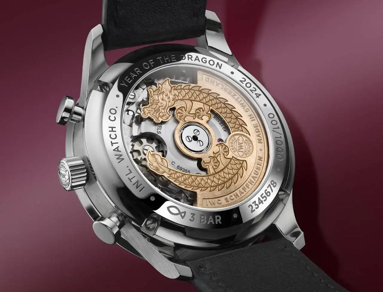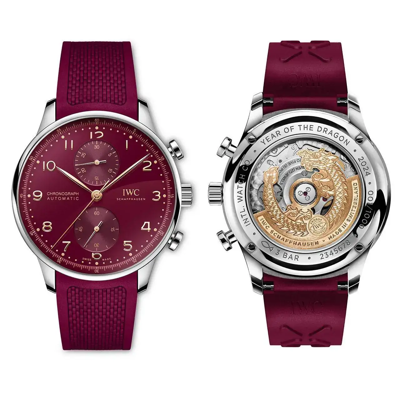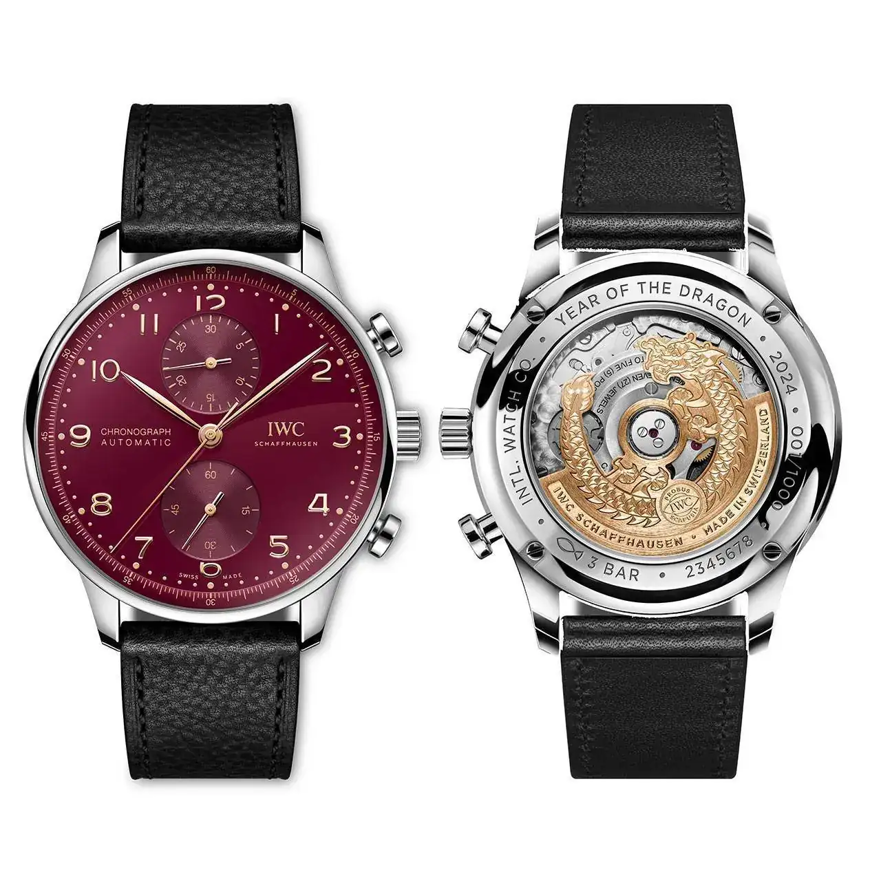 Para celebrar el comienzo del Año del Dragón, IWC Schaffhausen presenta una edición limitada del Portugieser Chronograph. El Portugieser Chronograph Year of the Dragon cuenta con una caja de acero inoxidable de 41 milímetros, una esfera burdeos y agujas e índices aplicados chapados en oro. Limitado a 1.000 piezas, su rotor tiene forma de dragón, visible a través del fondo de cristal de zafiro, que en su perímetro presenta un grabado de "2024 YEAR OF THE DRAGON". El Portugieser Chronograph Year of the Dragon se entrega con dos correas: una de piel de becerro negra y una de caucho burdeos. Se acompañan de un cierre desplegable en acero.