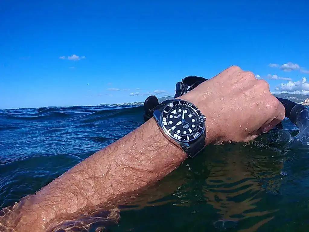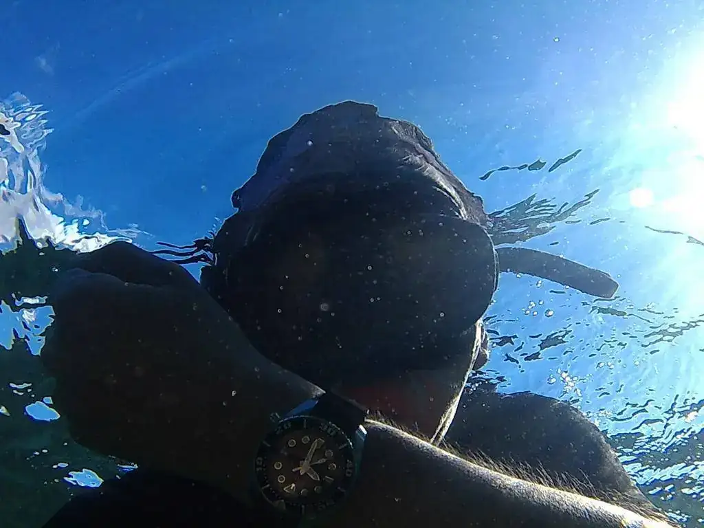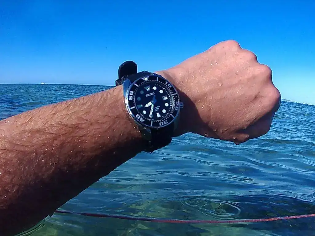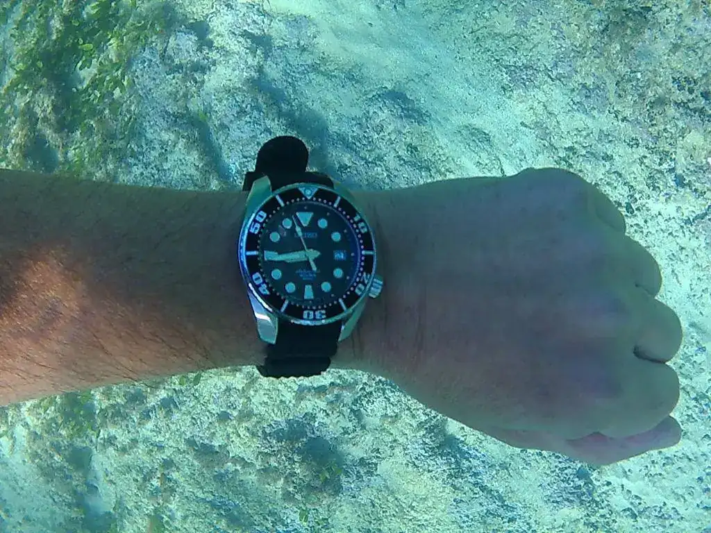 Bueno, ya somos unos cuantos que en el foro colgamos a nuestros "nenes" en remojo; hoy le tocaba al Seiko sumo. A las 8h de la mañana, el poniente hacía que el agua estuviese muy picada y un poco turbia, pero aún así hemos podido disfrutar de una buena jornada de pesca y de fotos. Cada vez me gusta más este diver