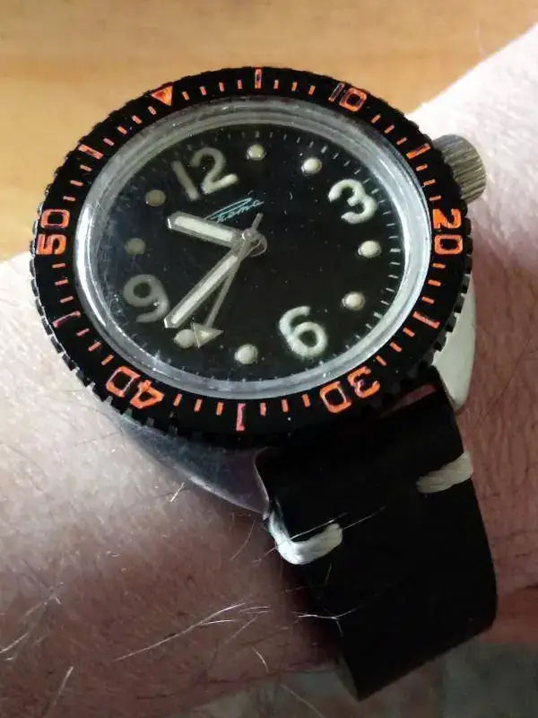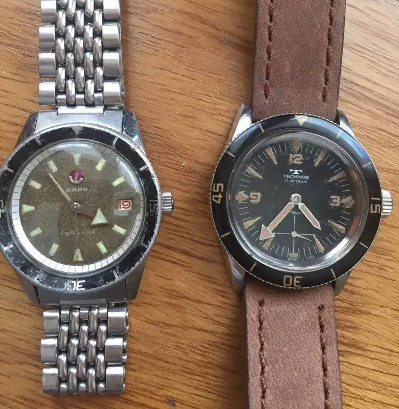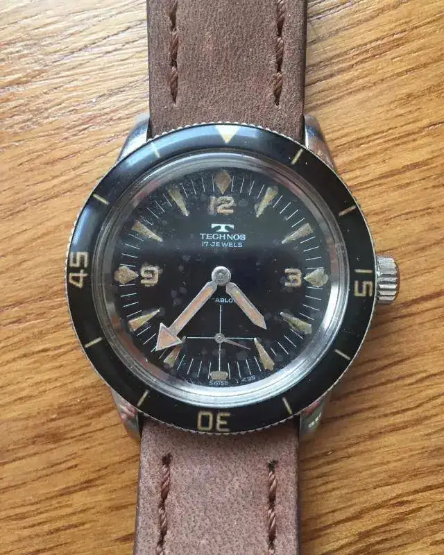 Comienzo con un Technos, una de las marcas más emblemáticas dentro de los Skin Diver, especialmente con su modelo "Automatic SKI DIVER", que compartía caja con modelos como el Titus Calypsomatic o UG Polerouter Sub. En esta ocasión la unidad mostrada es un poco mas antigua, y lleva calibre manual AS 1130, el famoso calibre "Wehrmachtswerk" que alimento muchos relojes del ejercito alemán en la WWII. Este Skin diver tiene un dial gilt con una pátina añeja y las marcas puntiformes típicas de la degradación de este tipo de diales, junto a la corona original, luce un bisel espectacular tipo Fifty Fathoms. En definitiva un reloj que pese a lo sencillo de su calibre, muestra una imagen en la muñeca que creo que lo dice todo.