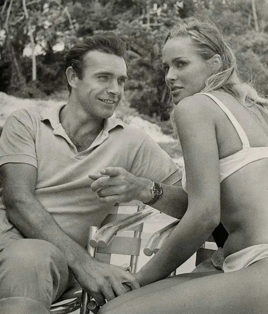 En Dr.No se ve bastante el reloj con su correa (la mitad de la película la pasa en mangas de polo) y de hecho, en una escena se quita el reloj y se lo da a su ayudante nativo para comprobar un detector Geiger con la radioactividad del lumen (detalle sacado de las novelas, pero ocurre en Thunderball y donde Leiter le dice algo así como si aun lleva ese viejo reloj com números fosforescentes. Aun no llevaba Rolex, se intuye algún tipo de reloj militar)