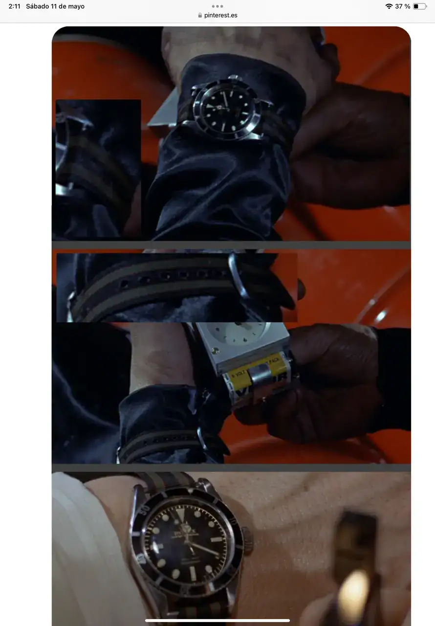 Tú sí que sabes, Íñigo.En Dr.No siempre lleva correa, al igual que en Desde Rusia. Es en la intro de Goldfinger donde lleva la famosa correa textil de un pasador (que no NATO) y tiene cierto sentido porque viene de una misión de buzo (com un pato falso en la cabeza) con traje de goma y el Rolex atado a la manga, llevando debajo el smoking crema. En Thunderball, donde también bucea bastante, también hay un primer plano del Submariner con la famosa “single pass” de rayas.