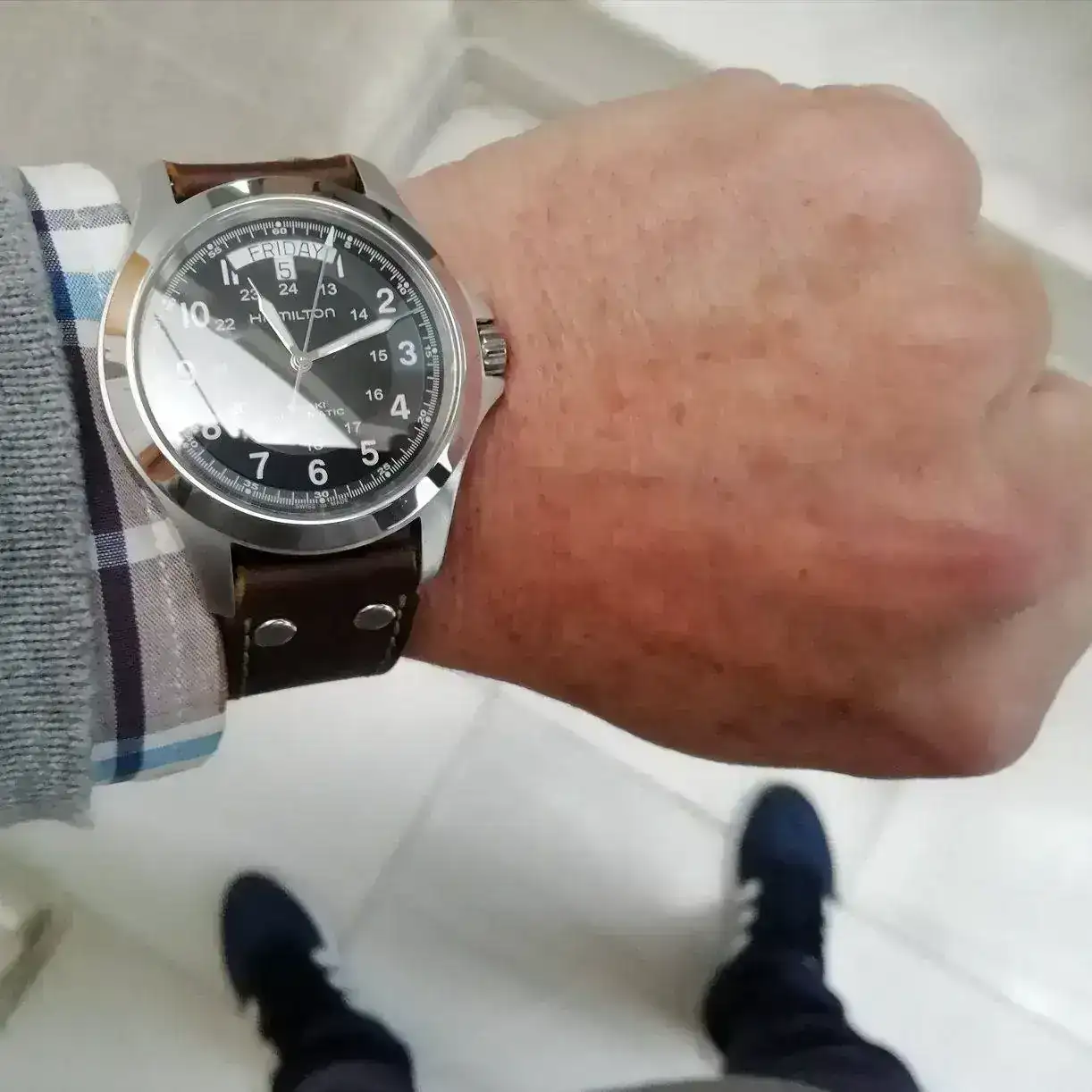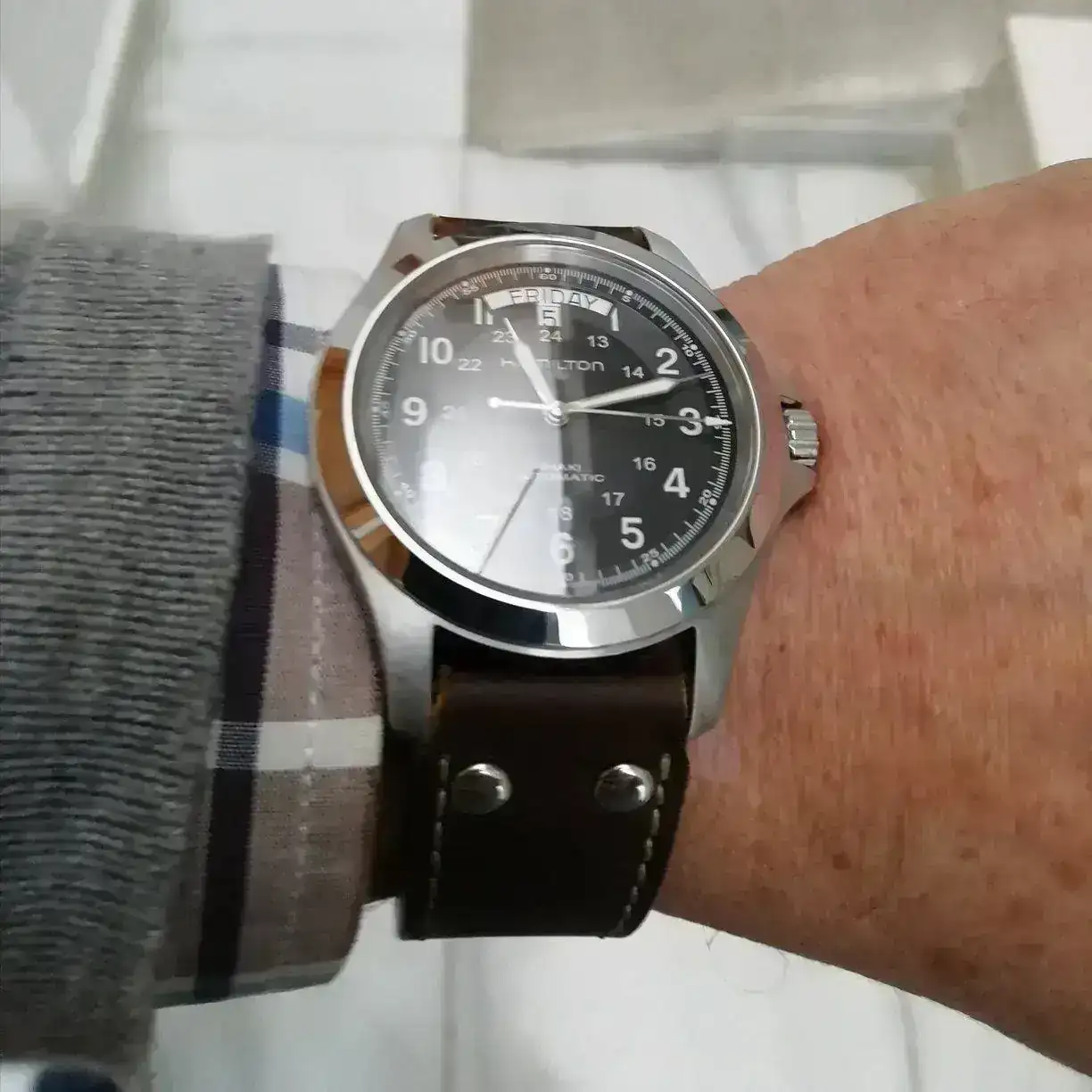 Hace una semana cambié a un compañero Mi tortuga por un Hamilton Khaki King, tras una semana de uso, la correa de fábrica no me convencía. La veía un poco delgadita para un Rey corpulento, quizás válida para el Field. Ayer le adapté esta correa y estoy encantado. Creo que ha ganado bastante. ¿que opináis?