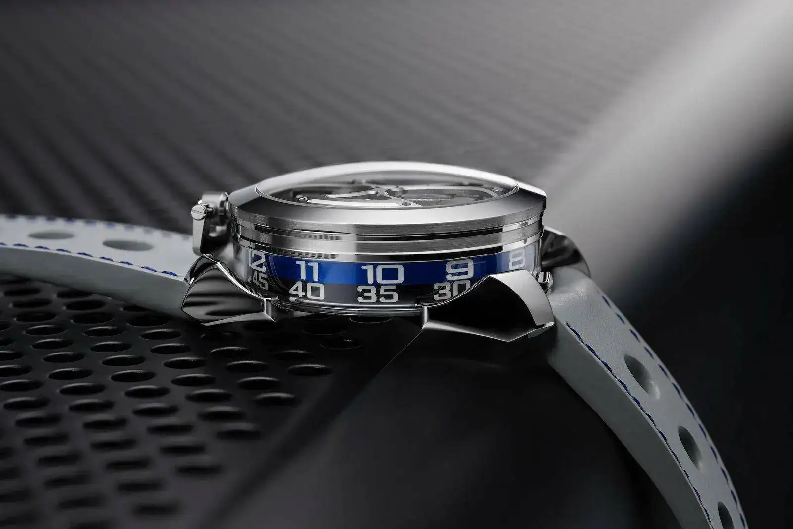 Básicamente se trata de un reloj con máquina Miyota -muy- modificada, que en lo que sería la esfera muestra un rotor de titanio y tungsteno y que da la hora mediante dos cilindros perimetrales a la carrura detrás de un cilindro de cristal mineral que los protege. El nivel de acabados, sin ser Alta Relojería, sí está a la altura de lo que se podría esperar de sus responsables, y en cualquier caso es diferente de casi todo lo visto.