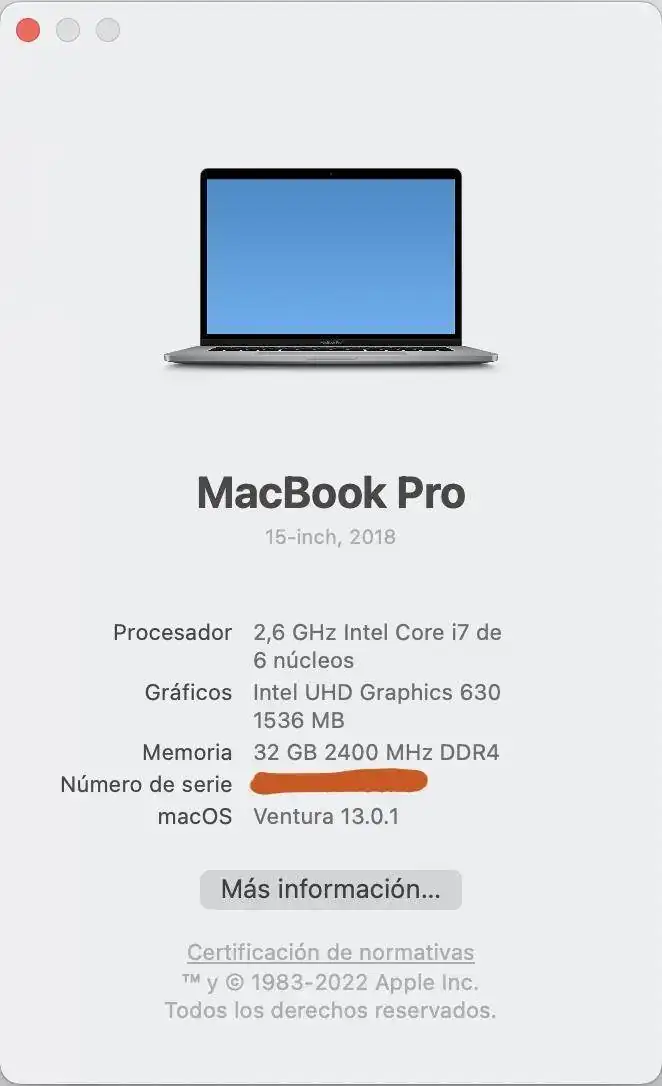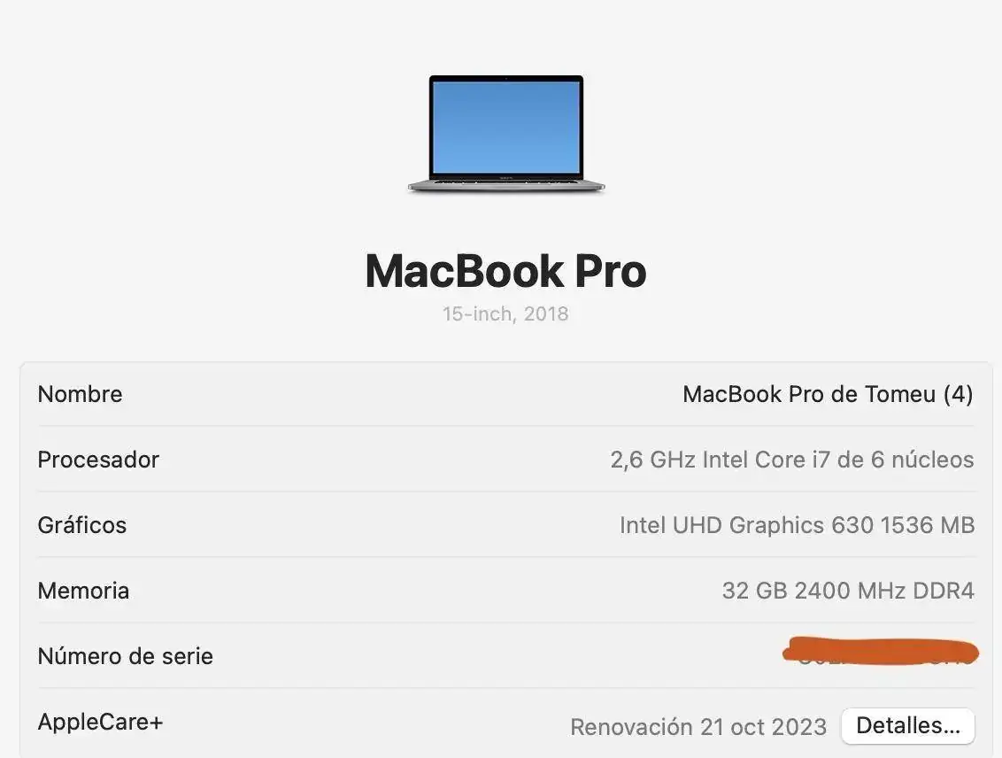 Es un Macbook Pro comprado en octubre de 2018 con el siguiente equipamiento: