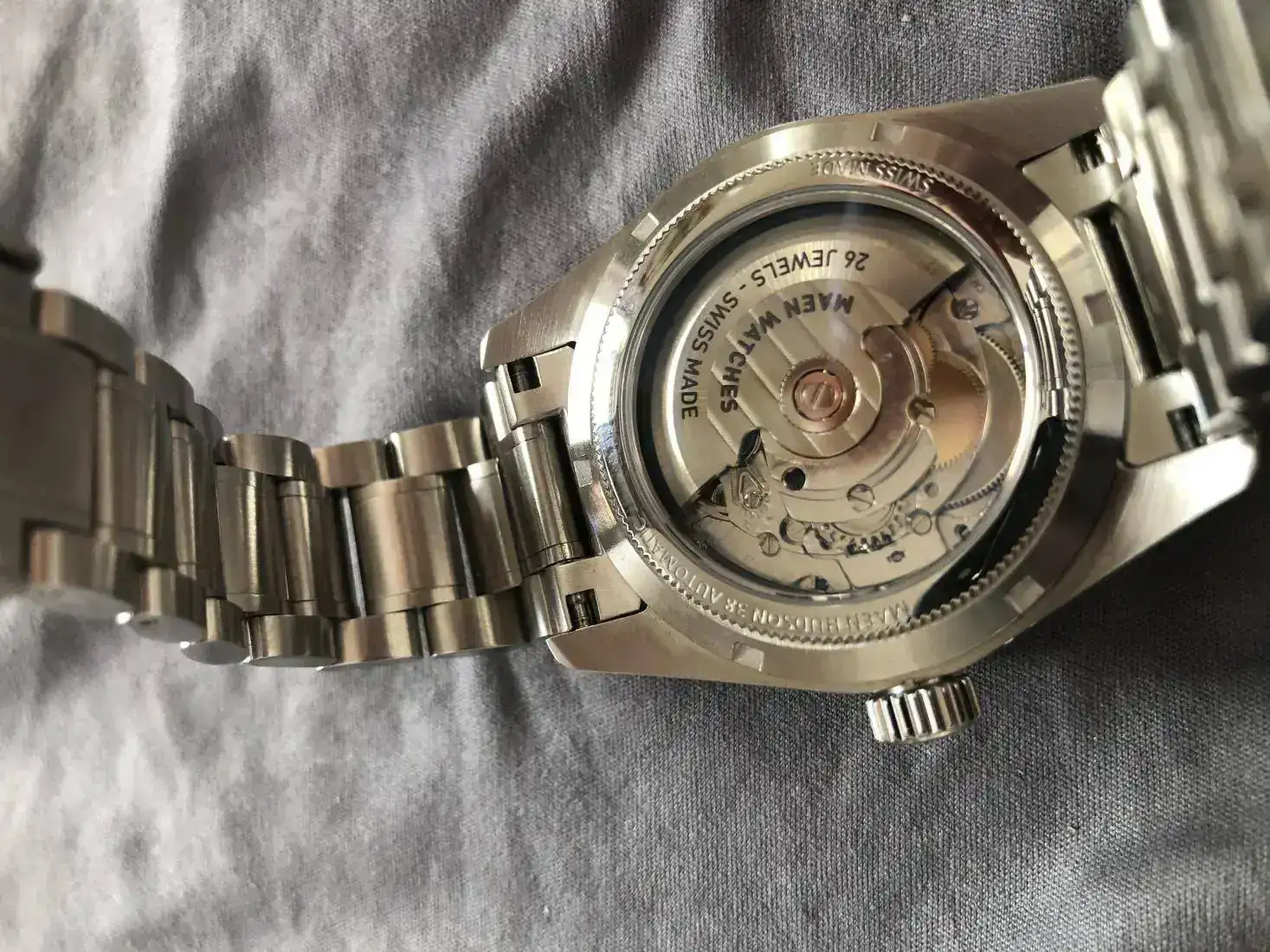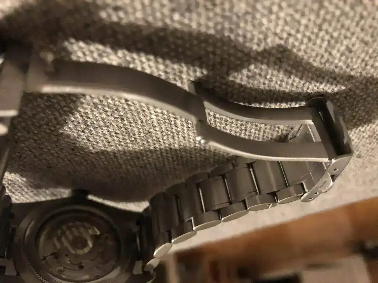 fondo visto con el mecanismo acabado top, armis ( quizás aqui echas en falta algun ajuste mas en el el cierre por si quitando eslabones se queda algo amplio o estrecho) muy ligero mate y con algunas partes pulida a espejo.