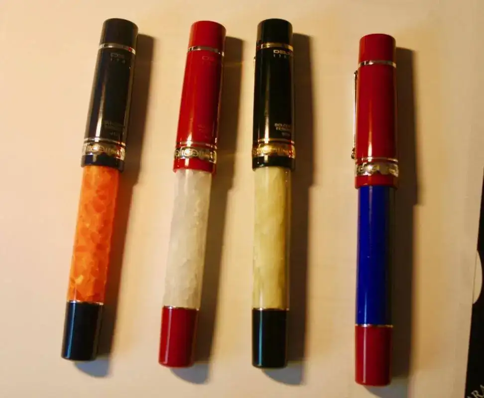 Hoy, que estoy rumboso, os ofrezco un espectacular lote de 4 plumas Delta Dolce Vita Federico Media, en diferentes colores. Todas son de resina, plumín oro 14k en puntos F y M (dos de cada). La medida es de 140mm y sistema de carga por pistón convertidor (una mezcla que hicieron con ellas). Todas llevan su número de serie correspondiente. No recuerdo el nombre de los modelos salvo uno (el bambú, para mí las más bonita). El precio, y aquí viene lo bueno, es de 85 (miserables, en este caso) euros por cada una, pero el lote entero sale por la increíble cantidad de 300 €. ¡Está loco! pensaréis, y algo hay de eso , sin duda...