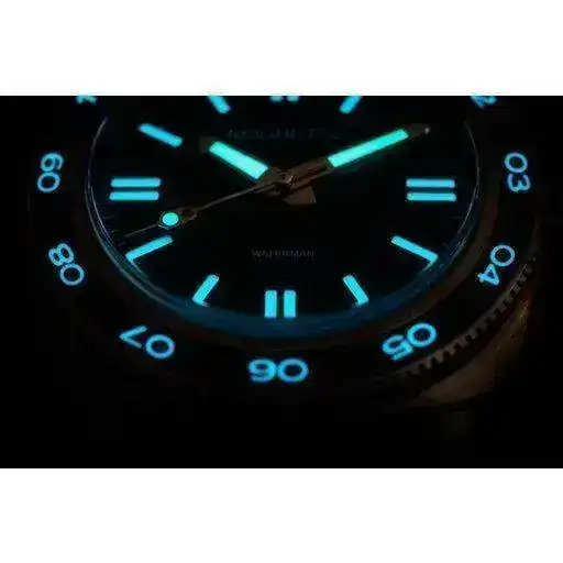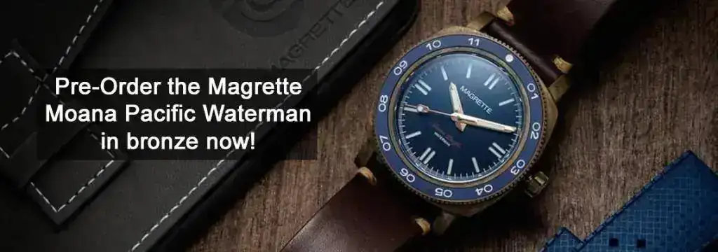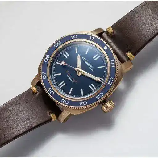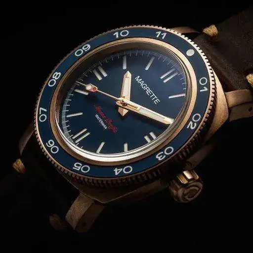First edition 500 pieces, future editions may be released depening on demand. CuSn8 solid bronze case and bronze crown. 42mm without crown Fine brushed finish 22mm at lugs. Tapers to 20mm at buckle. 51mm tbc Sellita SW200-1 Swiss Made automatic movement. 26 Jewels, 28.000 bph, power reserve of 38 hours and hacking function. Also used by brands like Sinn, Oris, Baume & Mercier, Bell & Ross, Eterna and many more. 500m - 50 ATM, viton gasket used in screwed-in case back Sapphire, high-domed with AR coating on the inside. Dark Blue sandwich dial. The seconds hand has a traffic light design. No Markers on the dial and bezel feature BWG9 Super LumiNova (white with blue radiation). The hands and pip on the bezel have C3 Super LumiNova (green) to give more contrast in the dark. The bezel is uni-directional with a blue matte ceramic insert with SuperLuminova BWG9 (markers) and C3 (pip at 12) lume. Itr can be used to set a second time zone. Blue rubber strap in "tropical" style and a vintage look brown leather strap. CuSn8 Bronze buckle with logo. Magrette travel case 24 months