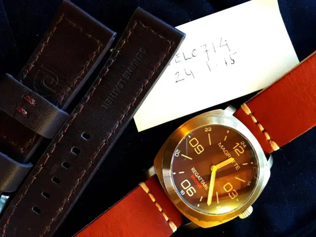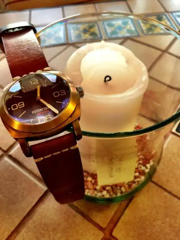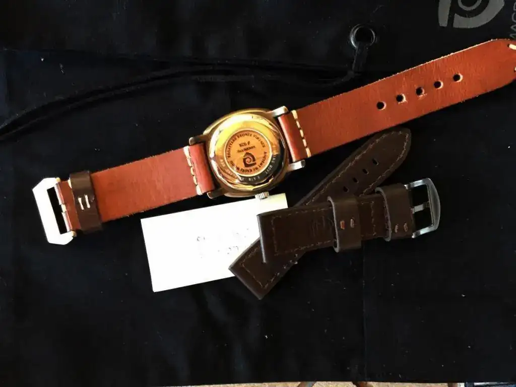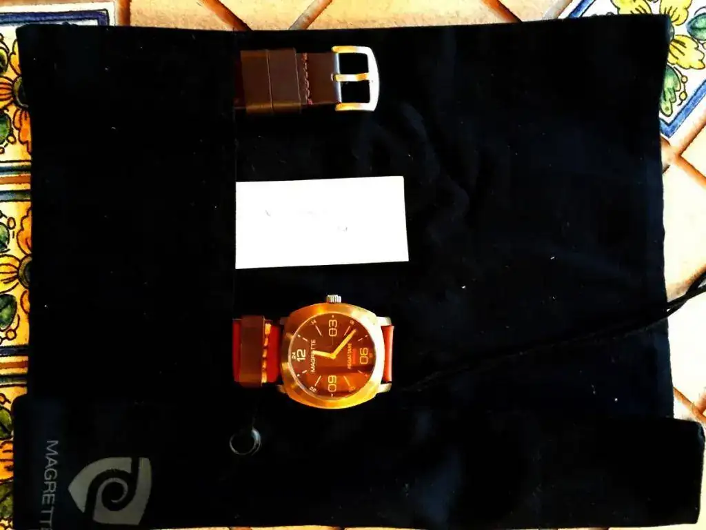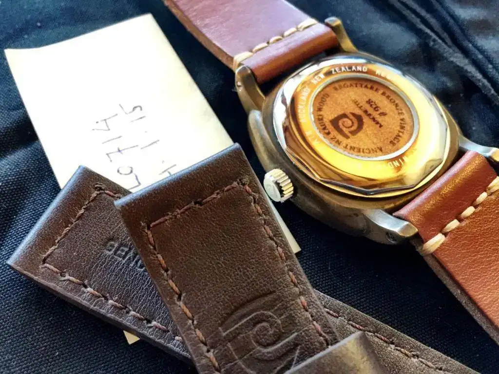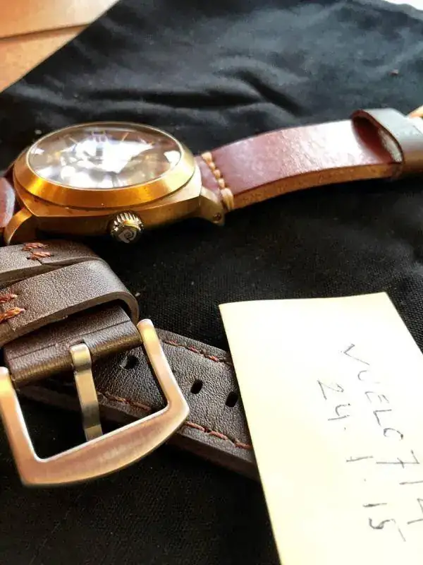Pongo a la venta este magnifico ejemplar, la correa de piel original no tiene ninguna puesta, y la otro esta al 98%, el reloj lo compre directamente a Todd Marshal gestor de Magrette, serie limitada a 1000 unidades, como vereis esta grabado el numero en la pieza de madera de Kauri, este fué de las últimas unidades, no tiene mas que unas 15 puestas, la patina es perfecta aunque lo bueno de estos relojes es que se la haces llegar hasta donde quieres o le das un trapo y netol y te queda deslumbrante.