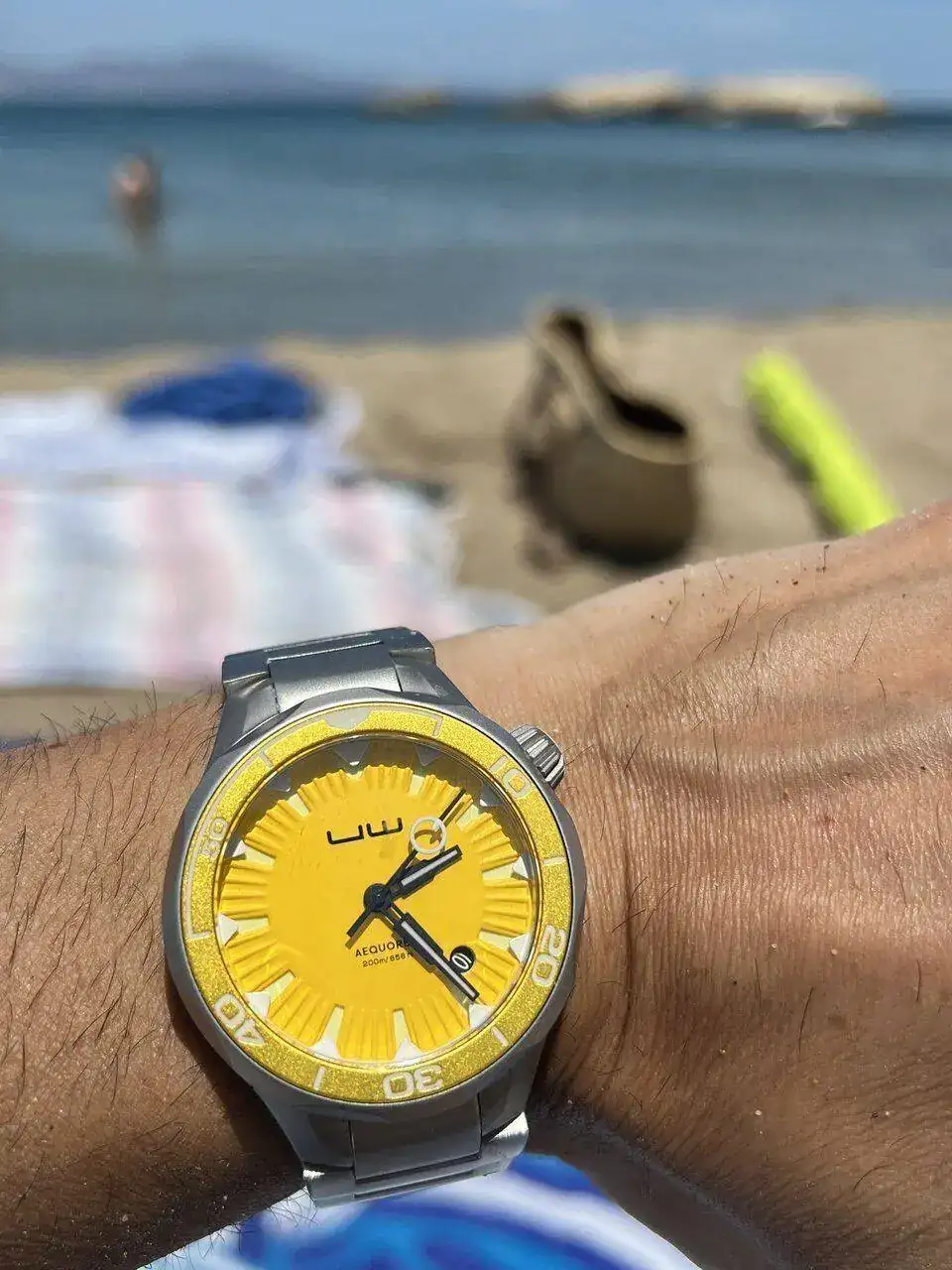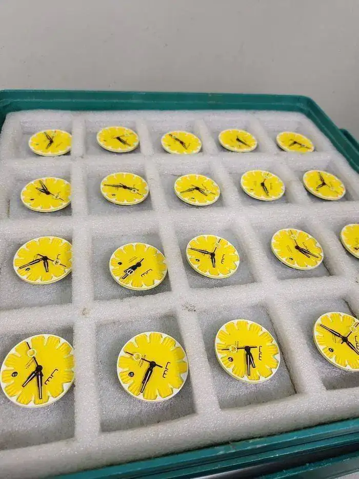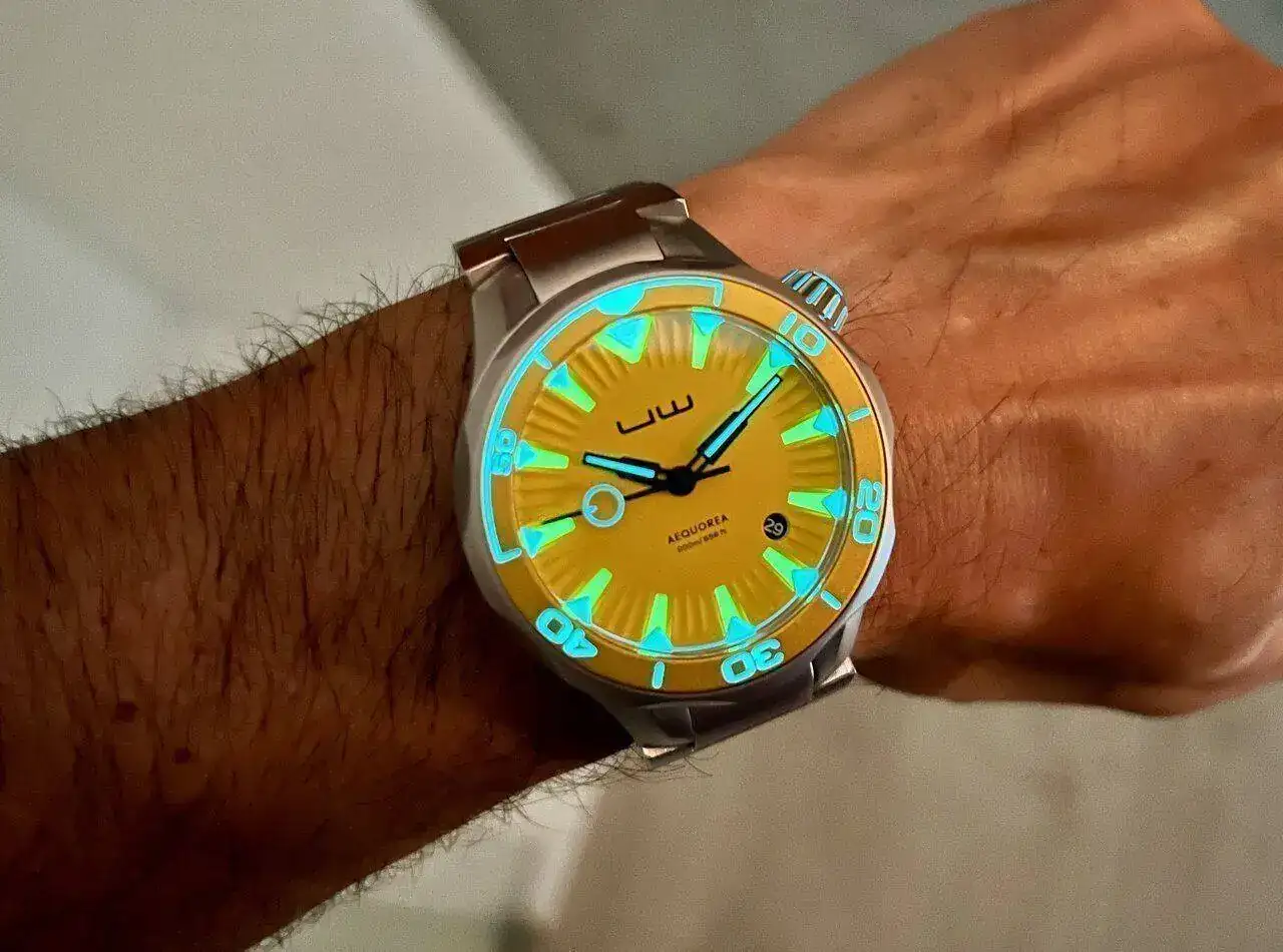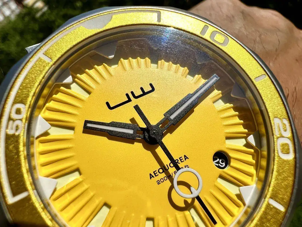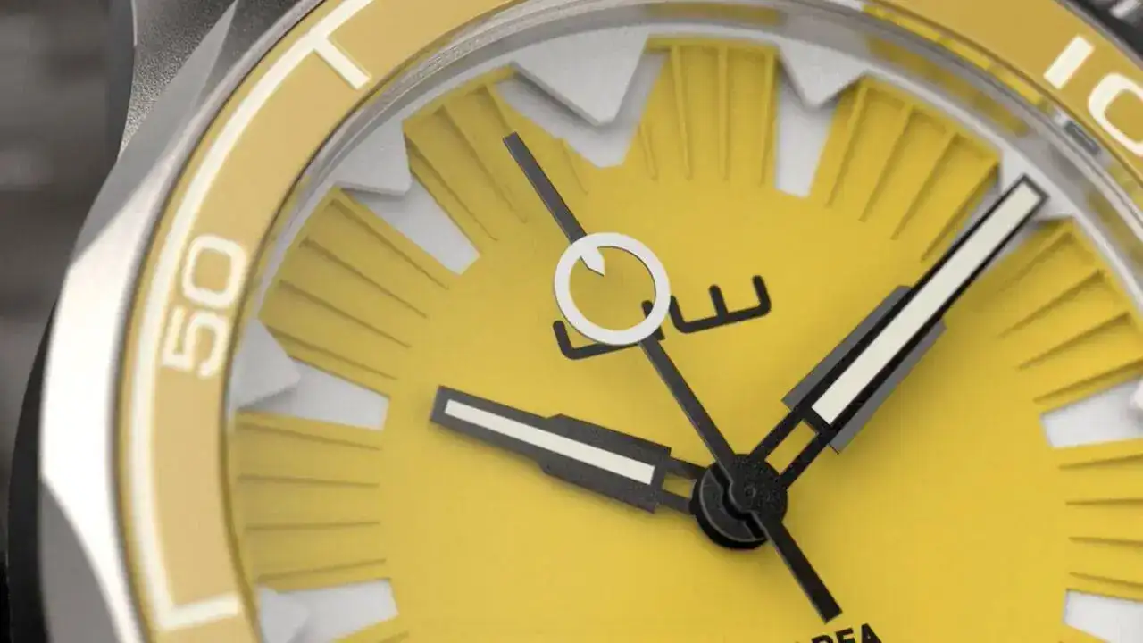 El dial es realmente especial: está constituido por tres partes (dial amarillo, aro exterior blanco y sandwich inferior luminiscente) con el texto imprescindible, todo ello muy bien resuelto. El disco del calendario, en el caso del dial amarillo, lleva las cifras en blanco sobre fondo negro, a juego con las agujas, las cuales son muy especiales, especialmente la trotadora: