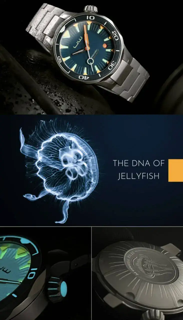El equipo de Under Water decidió crear su primer reloj con el tema de las medusas como leitmotiv. Me pareció muy interesante, ya que están presentes en los mares y océanos de todo el globo e incluso algunas son comestibles (yo las probé hace años, aunque me parecieron un tanto insulsas al lado de, por ejemplo, las ortigas de mar, que en realidad son anémonas, las cuales solemos comer en la costa mediterránea). La campaña estaba presentada con todo lujo de detalles y mostraba unidades físicas ya acabadas, en forma de prototipos de serie cero.