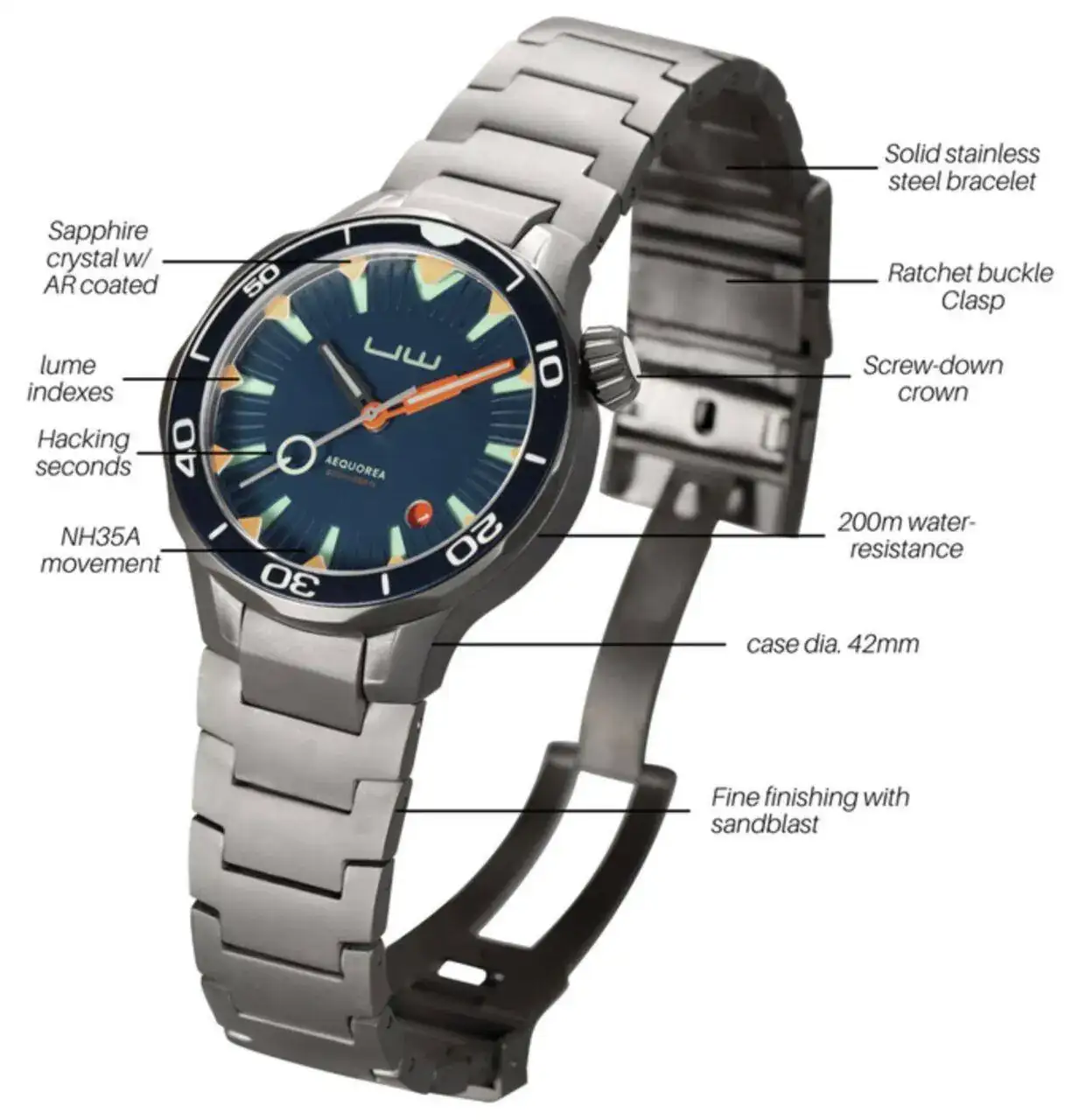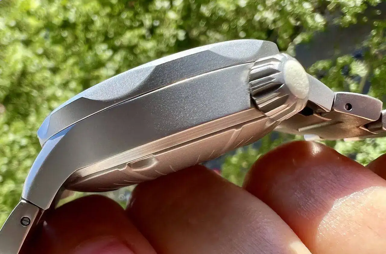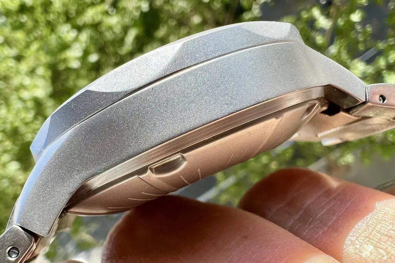 De nuevo estamos ante un diver, no tan contundente como los anteriores, pero resistente a los 200m (todas las medidas las tenéis en una imagen anterior), y con brazalete integrado. El acabado es del tipo arenado pero muy suavizado, casi sedoso. A priori parece delicado, pero ya veréis que no lo es en absoluto. La sensación general en mano es sencillamente impresionante: acabados perfectos, ni una rebaba, y el tacto suave del acero es soberbio, sin un solo fallo.