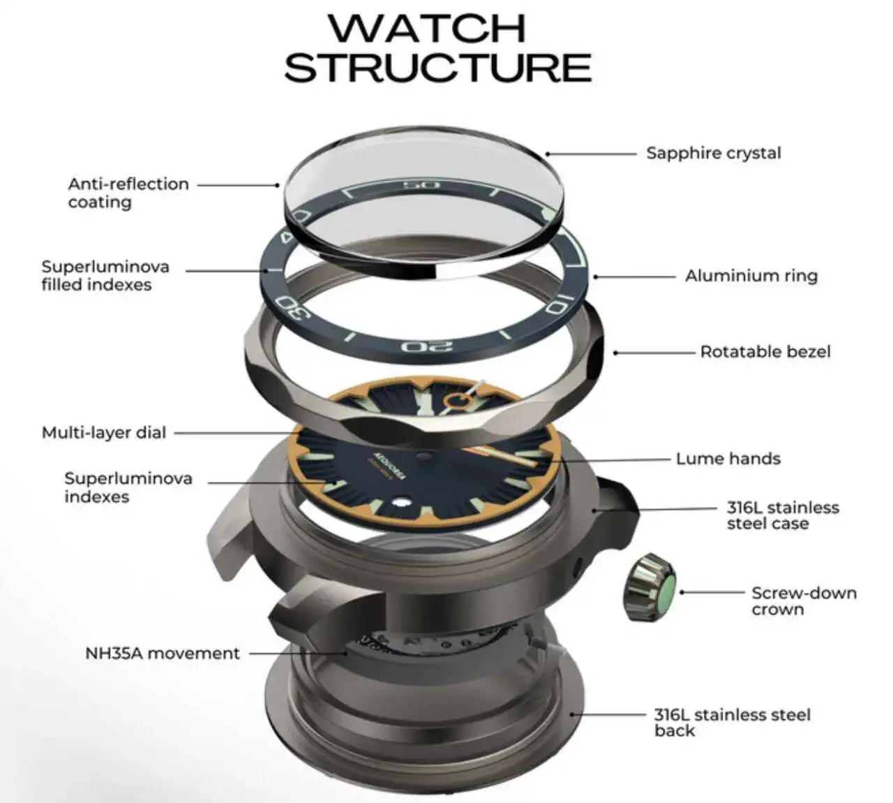 1.- Que las piezas que componen la mayoría del reloj (caja, brazalete, cierre, agujas, etc.) sean de creación propia, si no todas, al menos sí las principales.