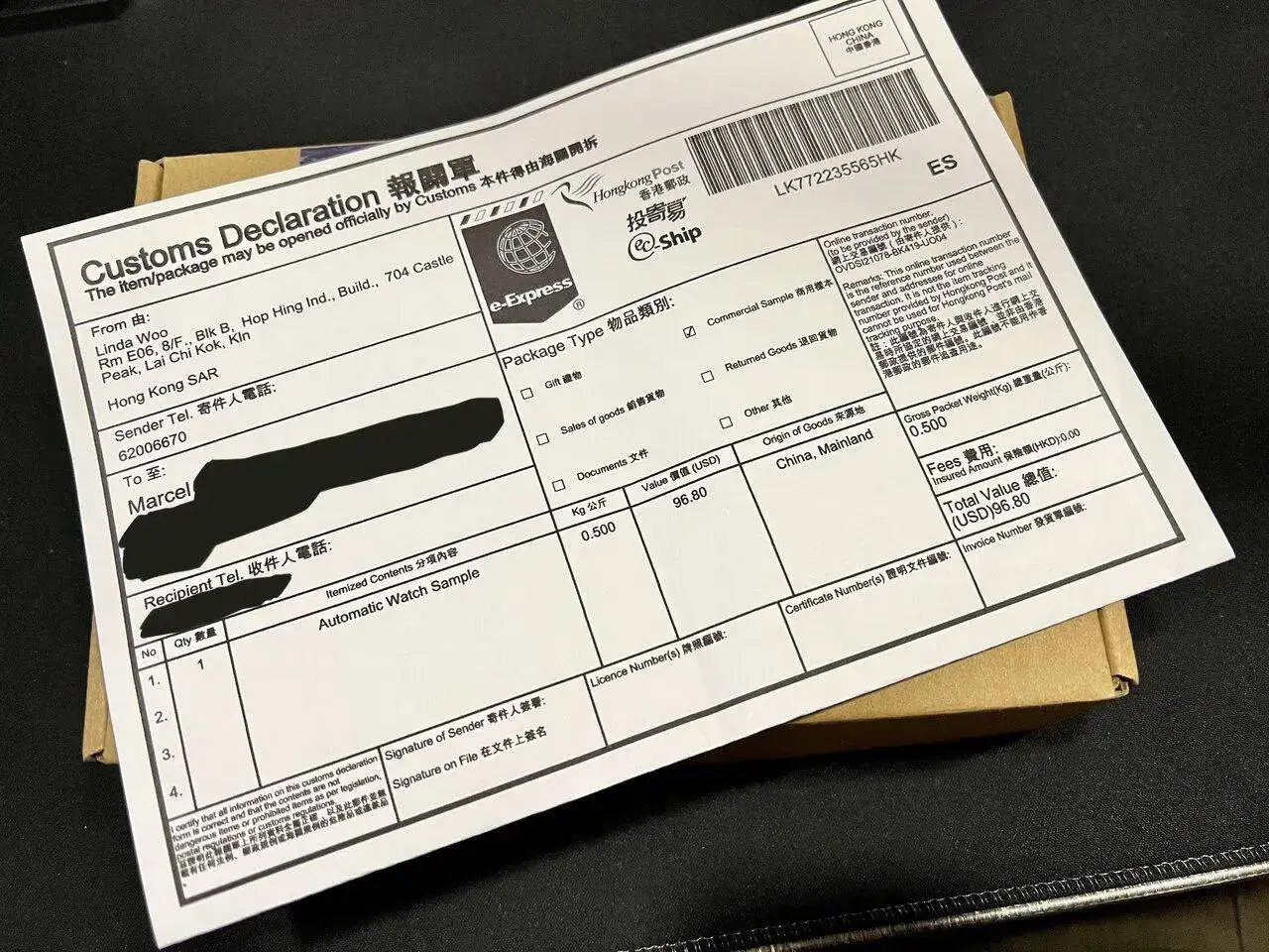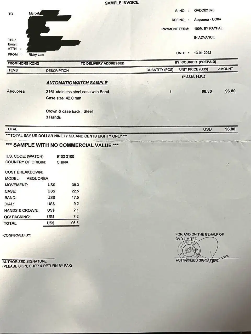 En primer lugar la documentación adjunta no deja dudas: el coste declarado ha sido de 96.80$ USA. Curiosamente el reloj ha sido enviado como muestra (sample), por lo que el valor declarado lo es a título estadístico.