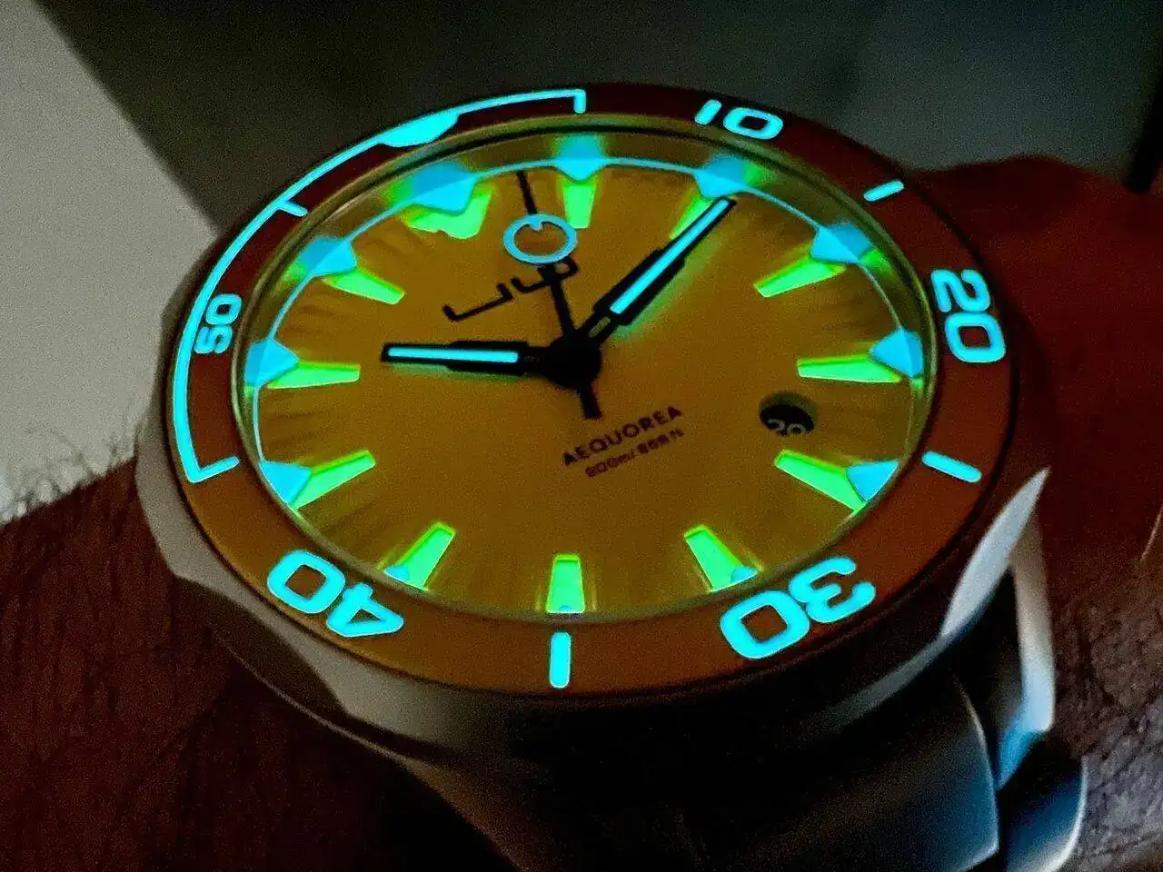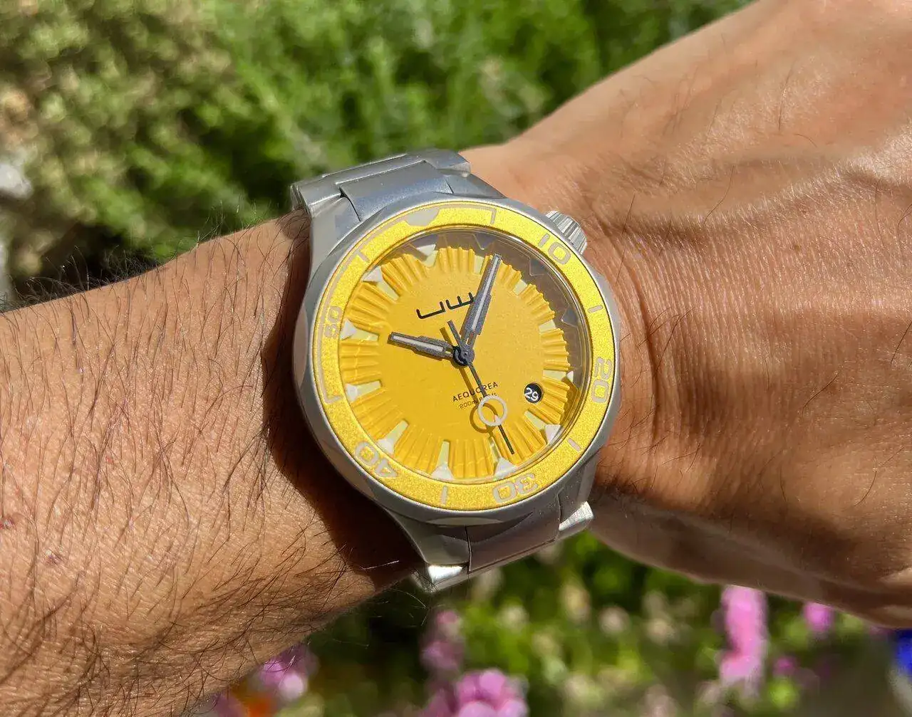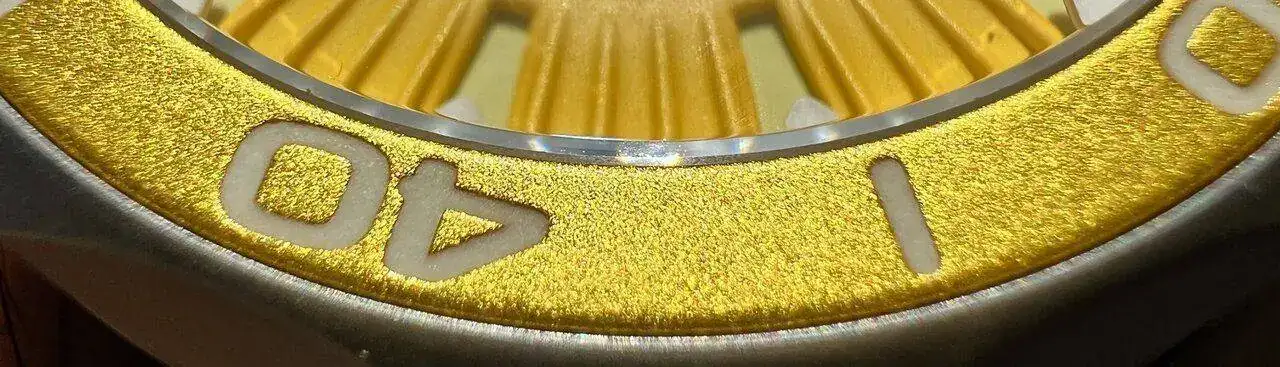 El bisel incorpora un insert de aluminio que, en el caso del que lleva el dial amarillo, es de un dorado oscuro que liga muy bien con el color principal. Gira firme pero sin sobresaltos y sin ningún tipo de juego:
